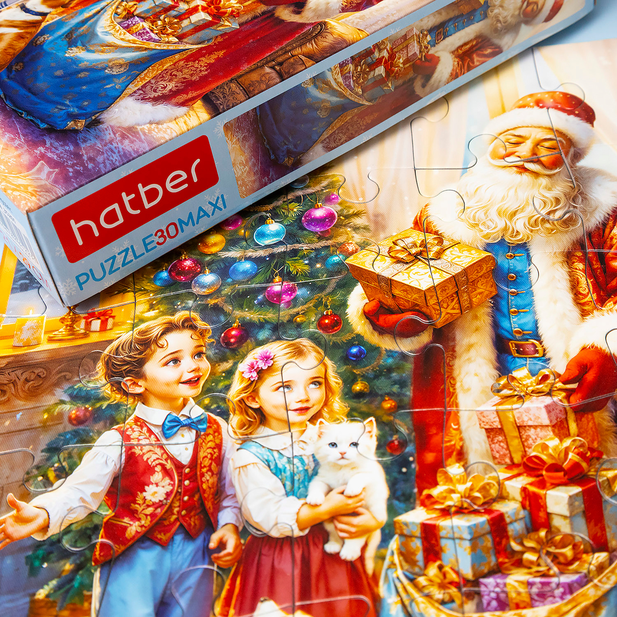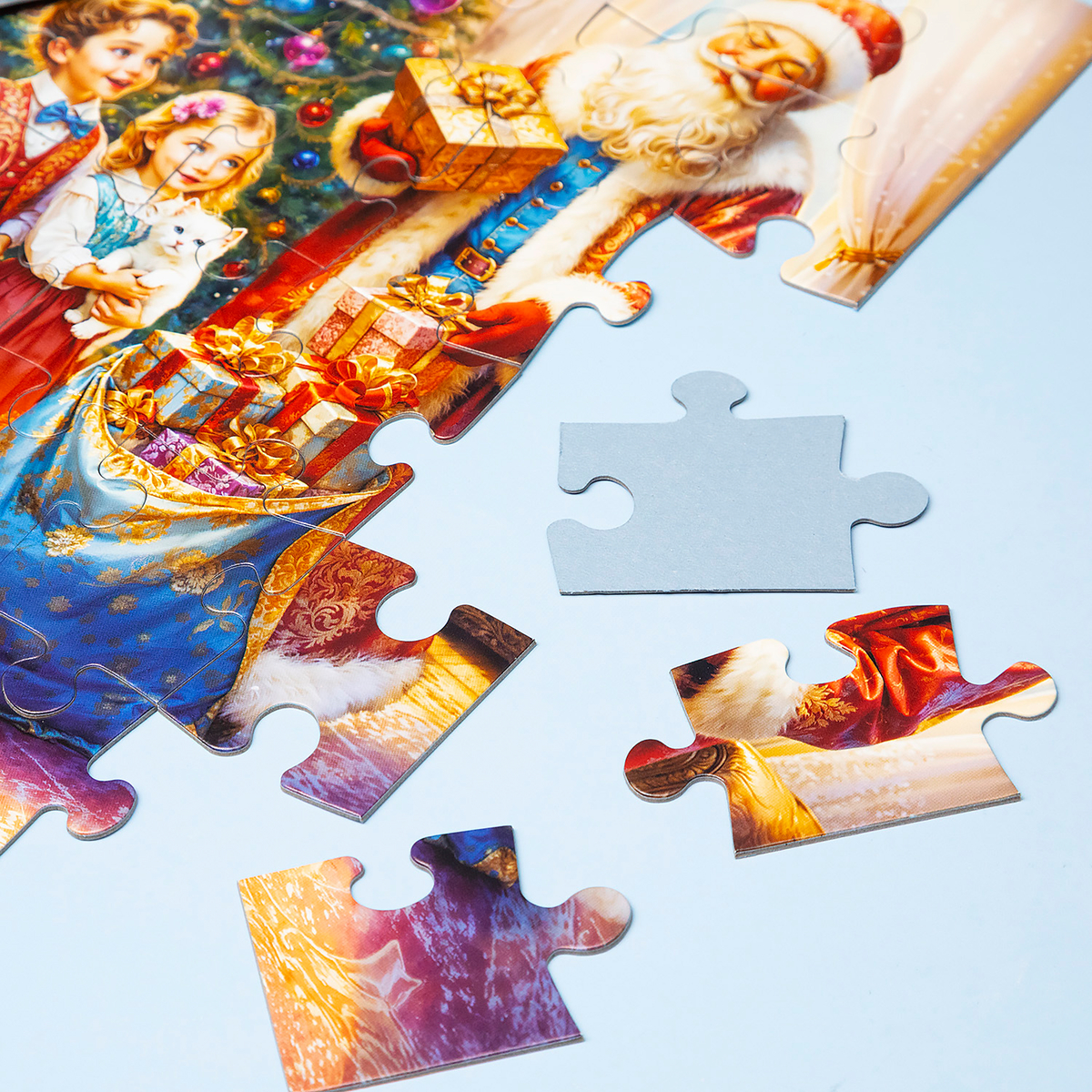 «Время чудес» — погрузитесь в атмосферу настоящего праздника! На этом пазле изображён Дед Мороз, который вместе с детьми и верным пушистым другом готовит подарки под нарядной ёлкой. Каждый деталь вносит в изображение атмосферу волшебства и новогоднюю магию, которая особенно ощущается в зимние вечера.