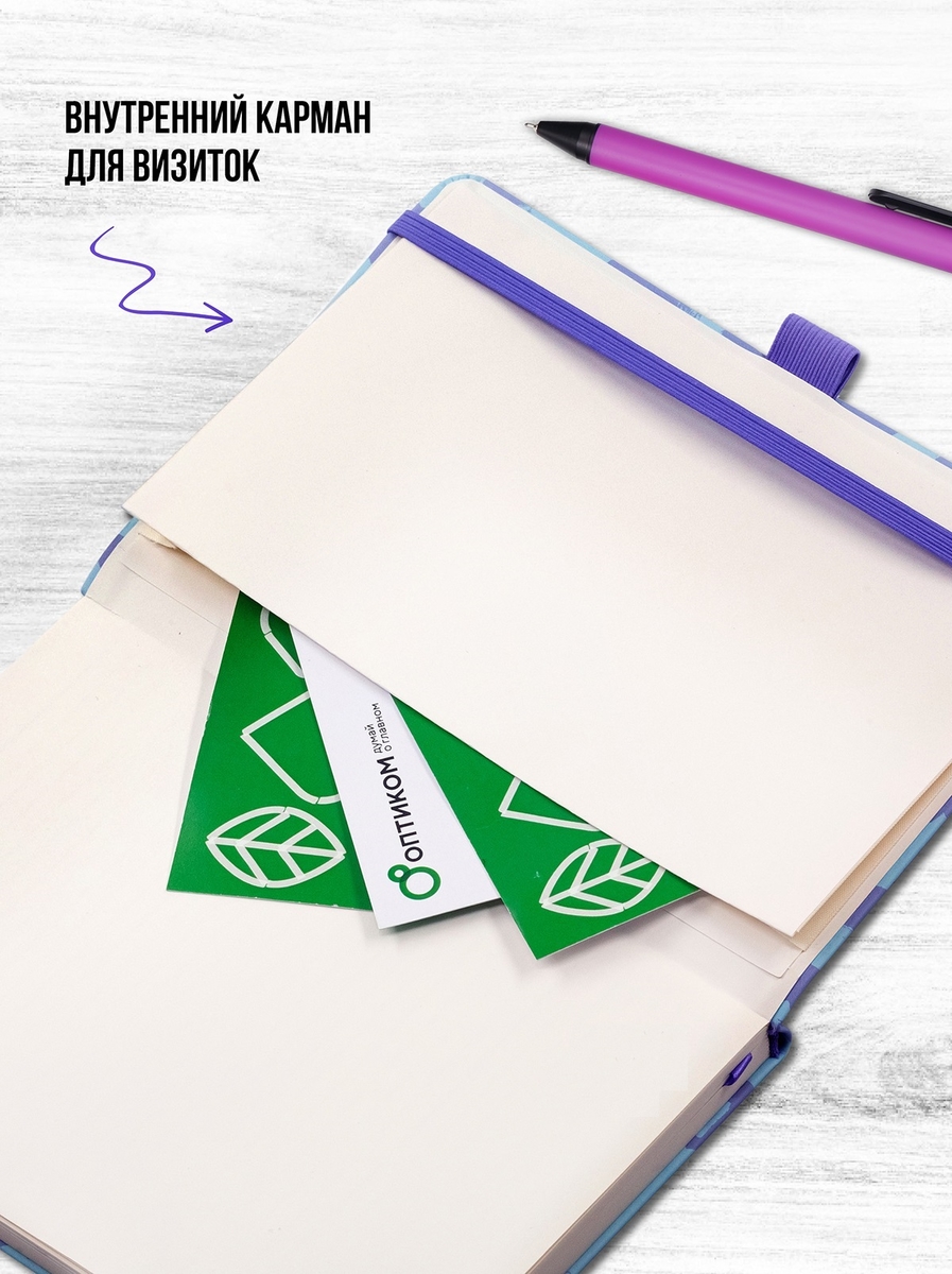 - Гибкая обложка из качественной эко-кожи с внутренним карманом для визиток.