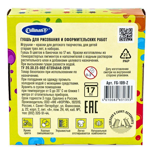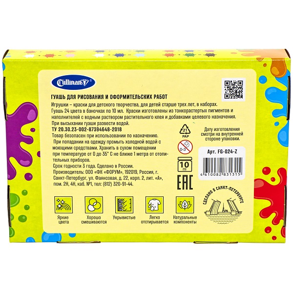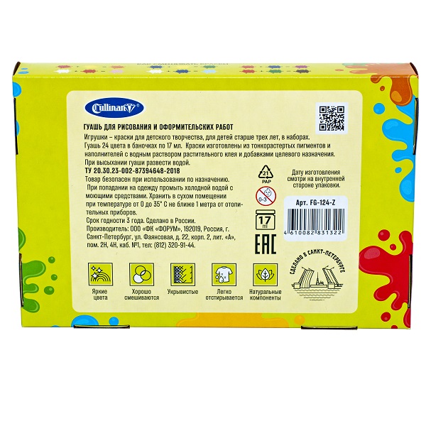 Гуашь Cullinan — идеальная краска для детского творчества! Дети могут рисовать нашей краской уже с трёх лет. Гуашь отлично ложится на бумагу, у неё нет неприятного запаха и она совершенно безопасна при использовании по назначению. А ещё можно смешивать цвета между собой и творить, творить, творить! Детские рисунки обязательно порадуют родителей, которые давно оценили высокое качество и доступную цену гуаши Cullinan!