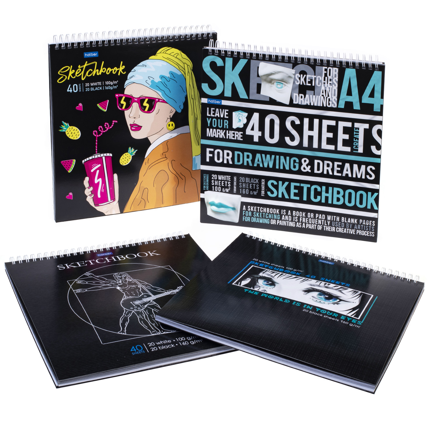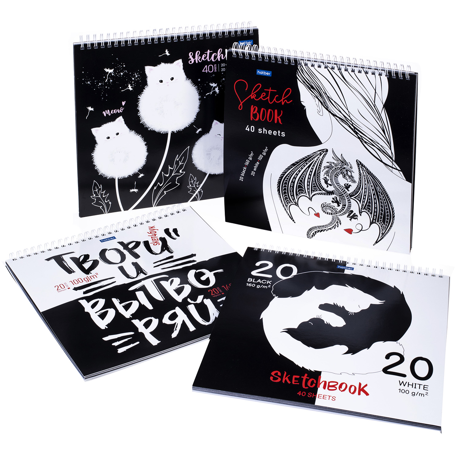 20 белых и 20 чёрных листов в скетче — этакие инь и ян в ваших руках. Плотная белая бумага отлично подойдёт для любых сухих техник, включая рисунок углём, графитом, цветными карандашами, пастелью, ручками и тушью. Чёрная бумага предназначена для эскизов пастелью, восковыми мелками, акрилом, акварельными карандашами, гуашью и тушью белых и других светлых цветов. Необычное сочетание двух разных видов бумаги подарит больше вдохновения и позволит испробовать разные техники в вашем творчестве.