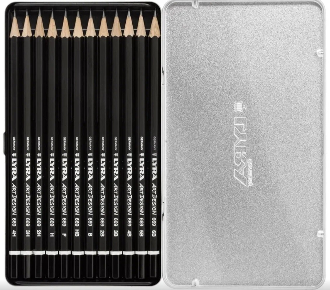 Решение творческих задач начинается с выбора инструмента, и компания Lyra предоставляет его. В наборе 12 карандашей разной степени мягкости: от 6B (самый мягкий) до 4H (самый твёрдый) для технического рисования.