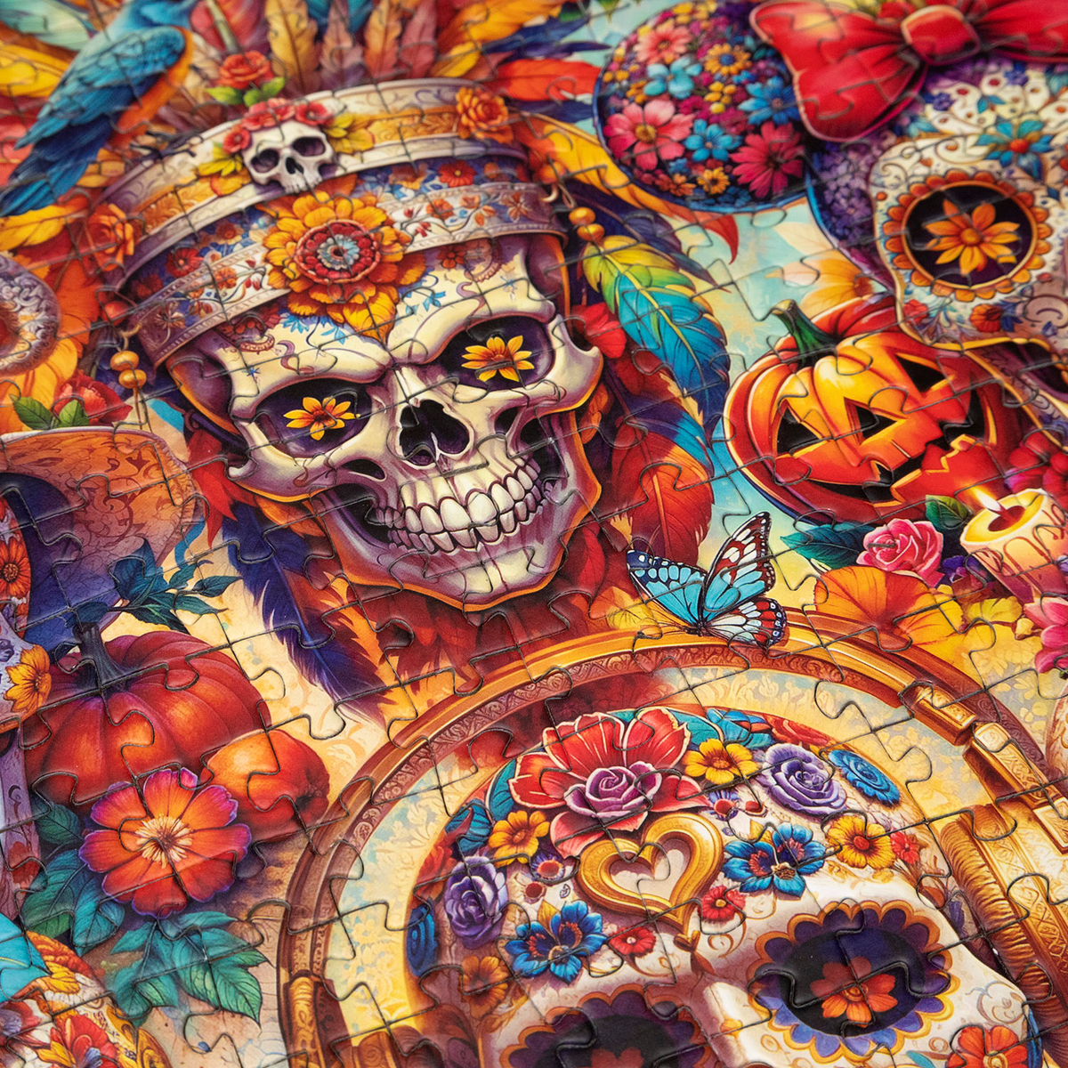 Черепа-калаверы — символ праздника жизни и ярких воспоминаний. Они расцвели цветами, покрылись затейливыми узорами, надели праздничные шляпы и даже надели наушники, чтобы звучала только лучшая музыка! В этом пазле каждая деталь — часть пульсирующего ритма праздника, в котором переплетаются традиции и современность. Собирая этот пазл, вы наполняете день энергией, позитивом и творчеством!