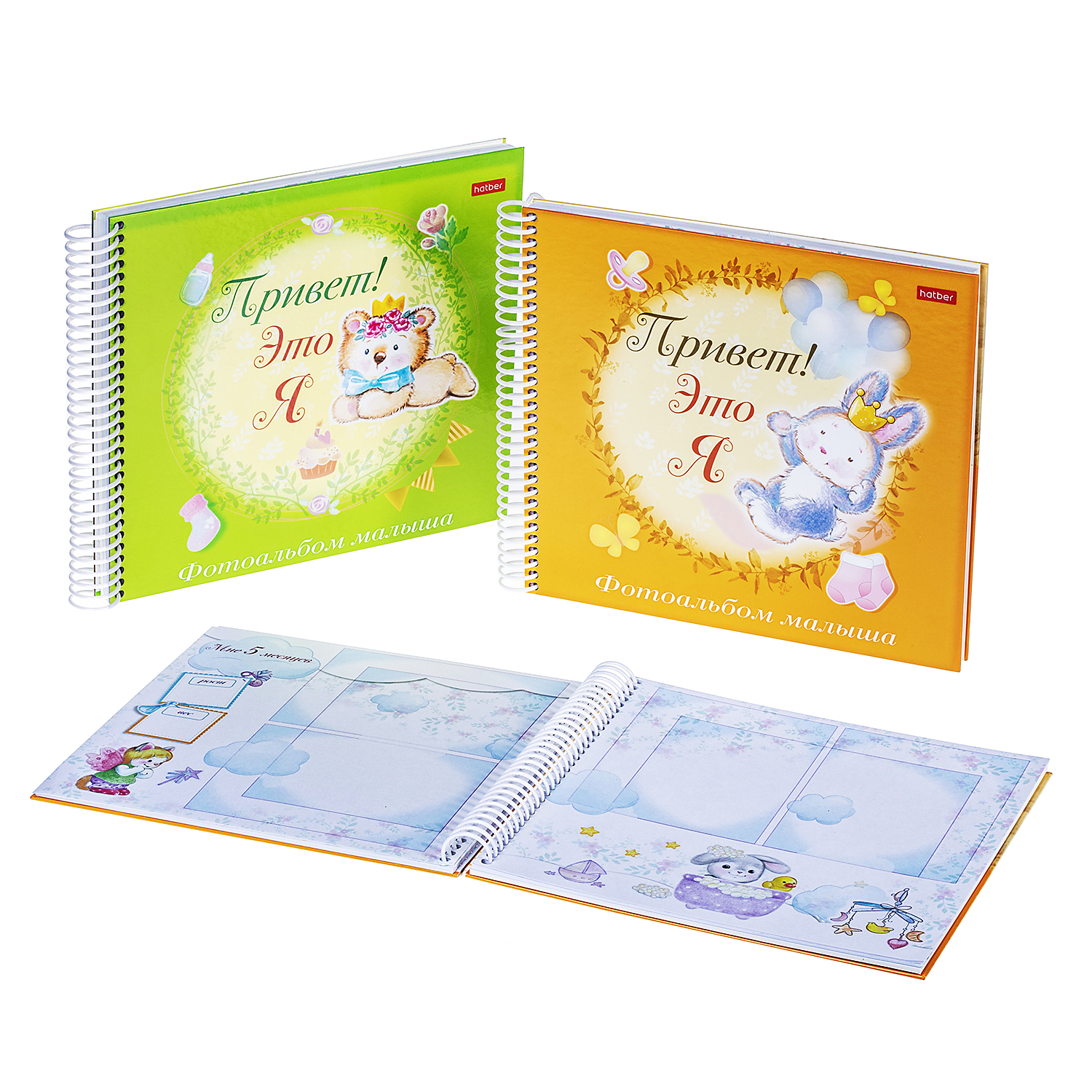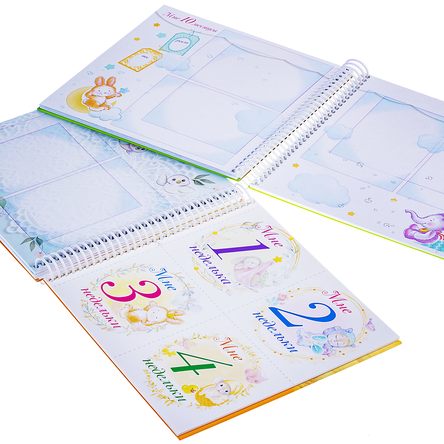 Фотоальбом малыша на 32 листа с твёрдой обложкой на пластиковой спирали оформлен невероятно нежными цветными иллюстрациями в пастельных тонах. В альбоме есть 24 странички для отпечатков ручек и ножек новорождённого, тематические страницы о самых важных событиях, развороты для каждого месяца, первый словарик, календарь достижений и еще многое другое.