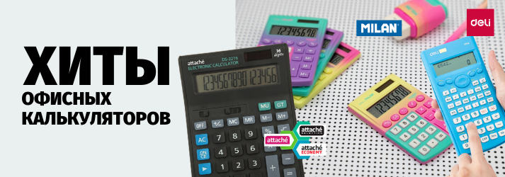 Самые популярные калькуляторы у брендов: Attache, Milan и Deli. Калькуляторы разных размеров и разных спектров применения: карманные, научные, компактные, полноразмерные.