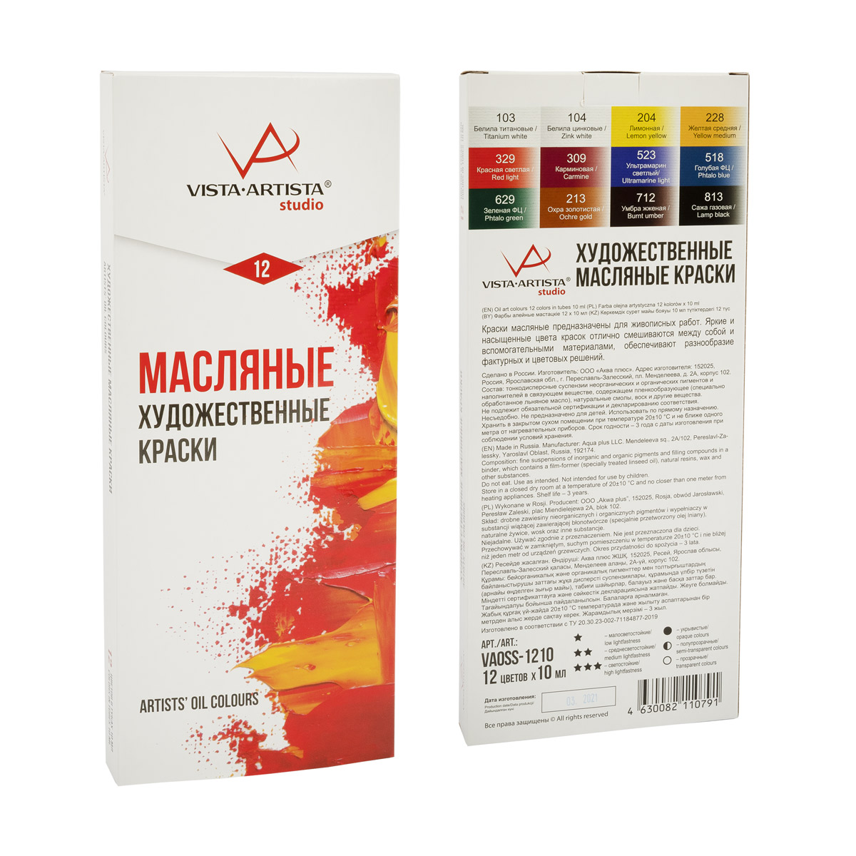 Художественные масляные краски VISTA-ARTISTA Studio (арт. VAOSS-1210) — это классическая цветовая палитра высокого качества: краски обладают хорошей укрывистостью и высокой светостойкостью. Изготовлены в России на основе льняного масла. В наборе представлены 12 ярких и насыщенных цветов в тубах по 10 мл. Краски отлично смешиваются между собой, позволяют получить разнообразие фактурных и цветовых решений.