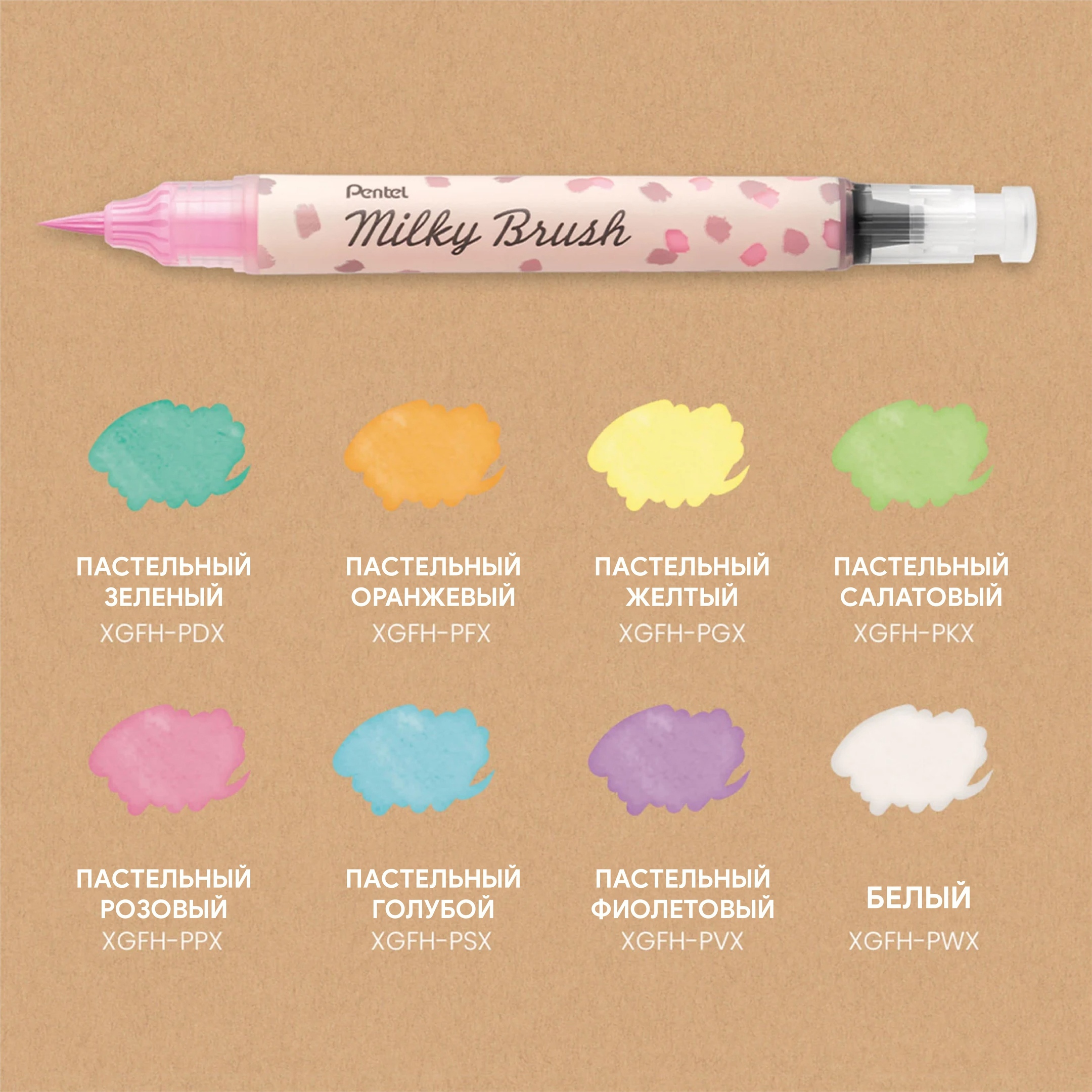 Pentel Milky Brush — это нейлоновые кисти, заправленные чернилами пастельных цветов. На выбор покупателям доступно восемь оттенков: белый, пастельный жёлтый, пастельный светло-зелёный, пастельный зелёный, пастельный голубой, пастельный фиолетовый, пастельный розовый, пастельный оранжевый.