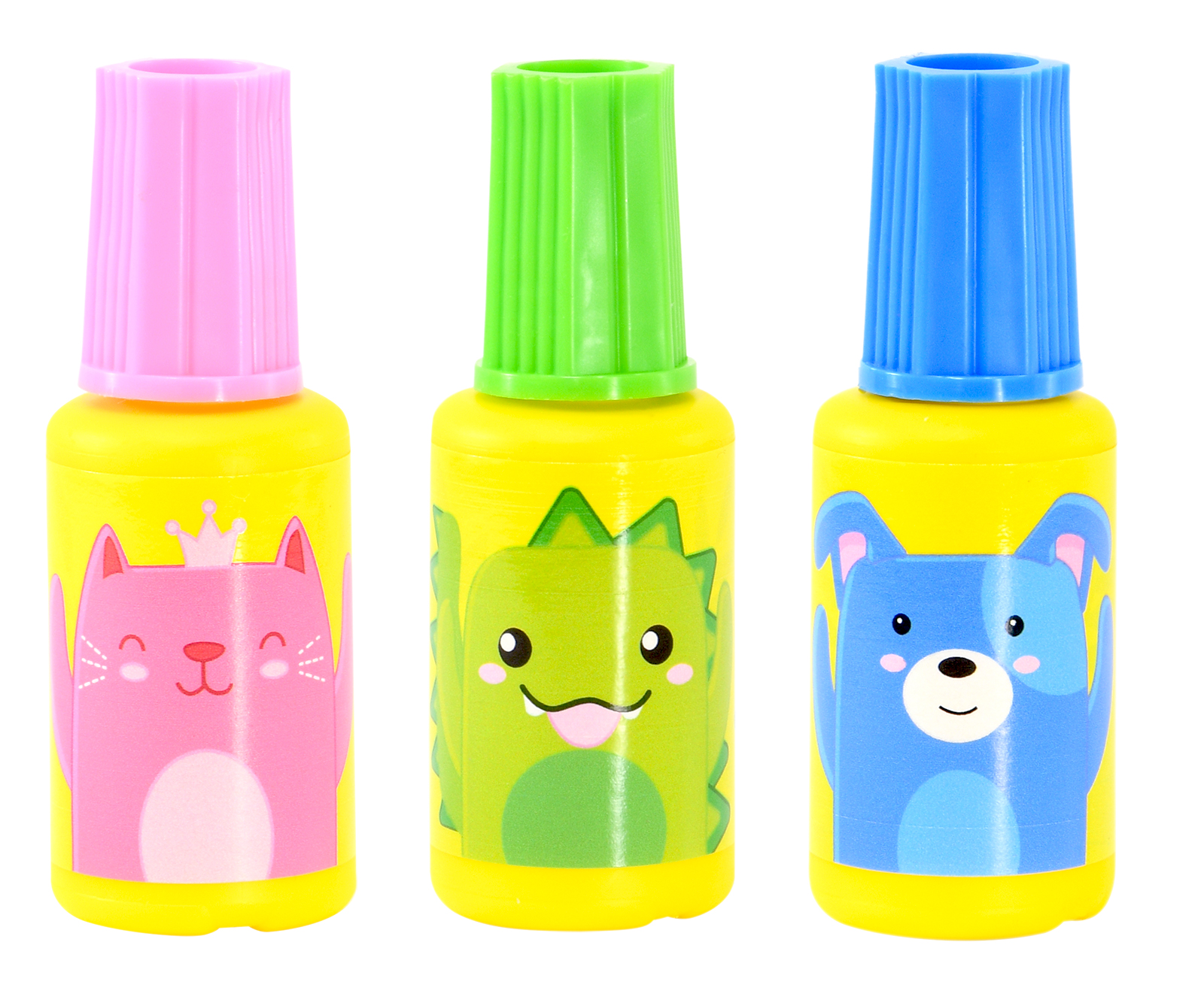 Клей ПВА с кисточкой — теперь не просто удобный инструмент для склеивания, но и отличный атрибут для игры! После редизайна упаковки на баночке появились три персонажа, которых очень любят дети: кошечка, динозавр и мишка.