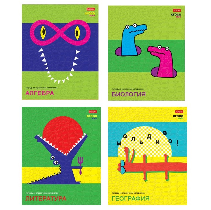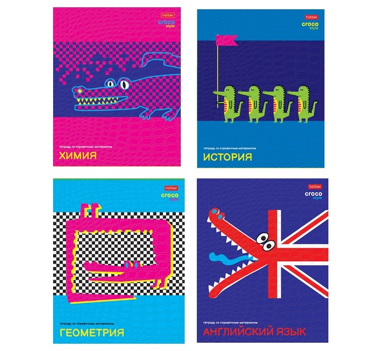 И первые, конечно, знаменитые уже крокодилы — главные герои серии CROCO. Яркие, забавные, кислотных цветов, они заставляют обратить на себя внимание. Дизайнеры Hatber придумали очень интересные образы кроко-персонажей. Ещё одним плюсом в копилку серии CROCO стало тиснение обложки под кожу крокодила. Такое решение добавляет стиля и реалистичности задуманному концепту.