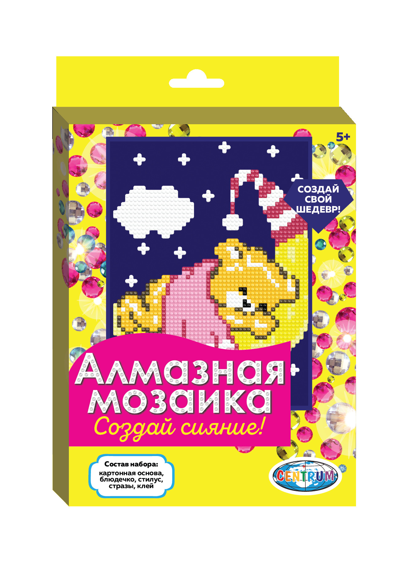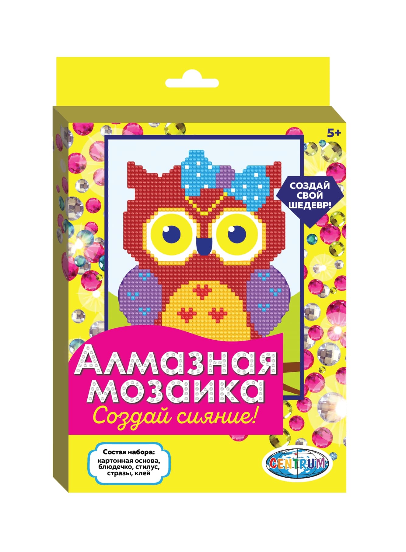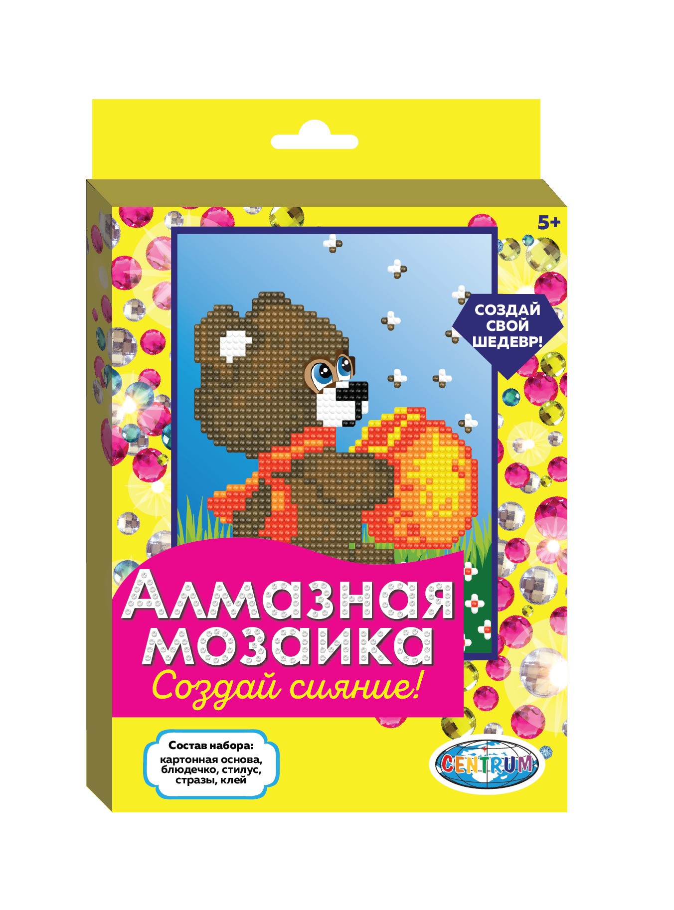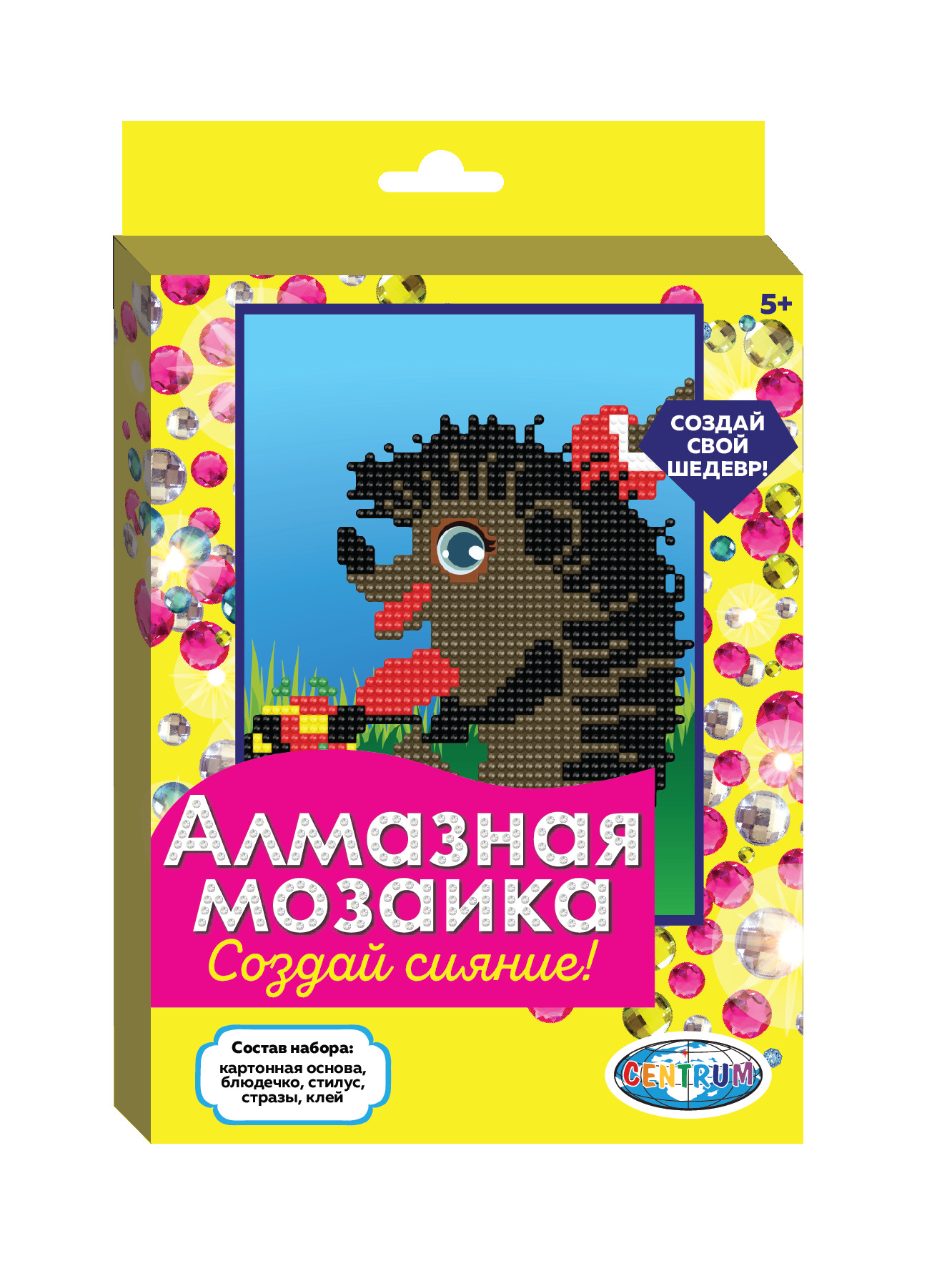 Новые наборы для творчества от Centrum позволят самостоятельно освоить технику алмазной живописи. В ассортименте подборка упрощенных сюжетов, предназначенная для детей от 3 лет. Набор подразумевает частичную выкладку страз. Процесс создания абсолютно не сложен, не требует особых навыков и умений. Необходимо наносить стразы на основу в соответствии с нумерацией. Наборы включают все необходимые материалы: готовую основу с нанесенным клеем, пластиковые круглые стразы, упакованные в пронумерованные пакетики, пластиковый стилус, клей и емкость для страз.