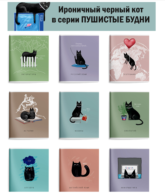 Серия предметных тетрадей «Пушистые будни» — это забавная концепция, в которой главный герой — ироничный чёрный кот. Дизайн создан специально под каждый школьный предмет с элементами юмора. Темы с котиками ежегодно занимают топовые позиции в трендах, это беспроигрышный дизайн для мальчиков и девочек.