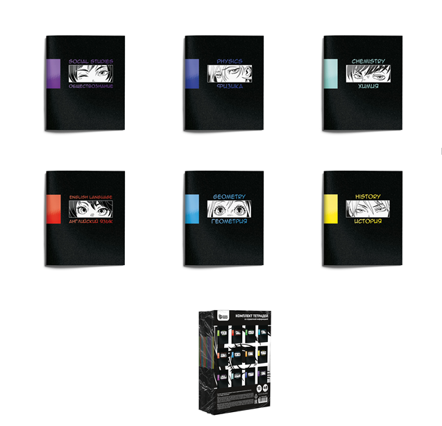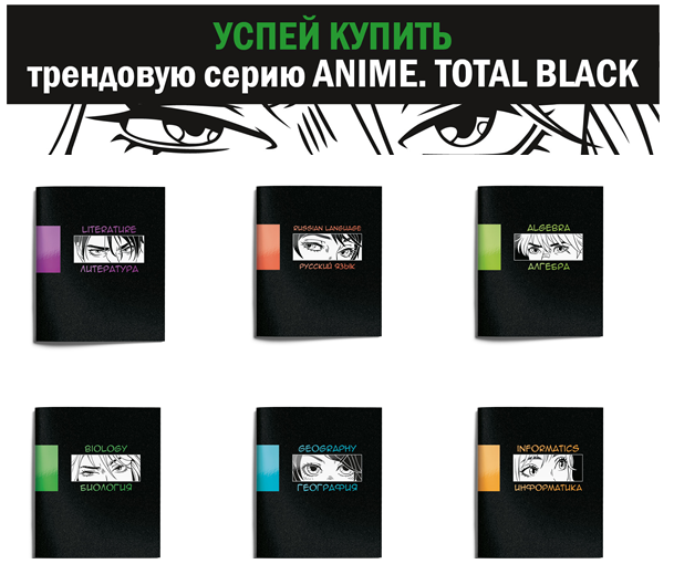 Популяризированная тема аниме стала больше, чем просто мультики, это целая субкультура, за которой следуют тысячи подростков и даже взрослые! Любители аниме оценят серию предметных тетрадей ANIME. TOTAL BLACK. Она соединила в себе минималистичное исполнение и трендовое направление. Цветные корешки под каждый предмет помогут найти нужную тетрадь в рюкзаке. Обложки тетрадей выполнены с отделкой твин-лак.