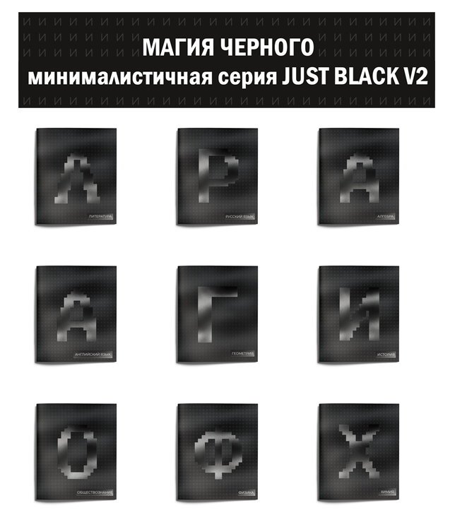 Серия предметных тетрадей JUST BLACK V2 создана в чёрном минималистичном стиле с использованием эффекта твин-лак. Сегодня чёрный цвет в любом атрибуте стиля, в том числе и в канцелярии, — это классика, он всегда в тренде. Строгий и лаконичный дизайн — именно то, что нужно новой молодёжи.