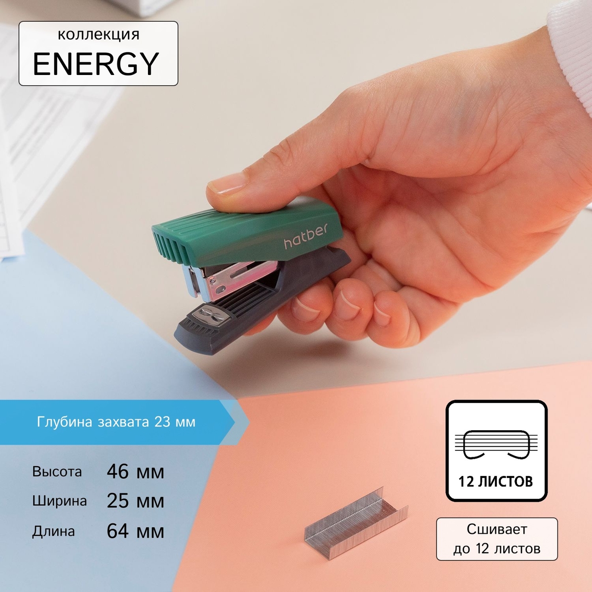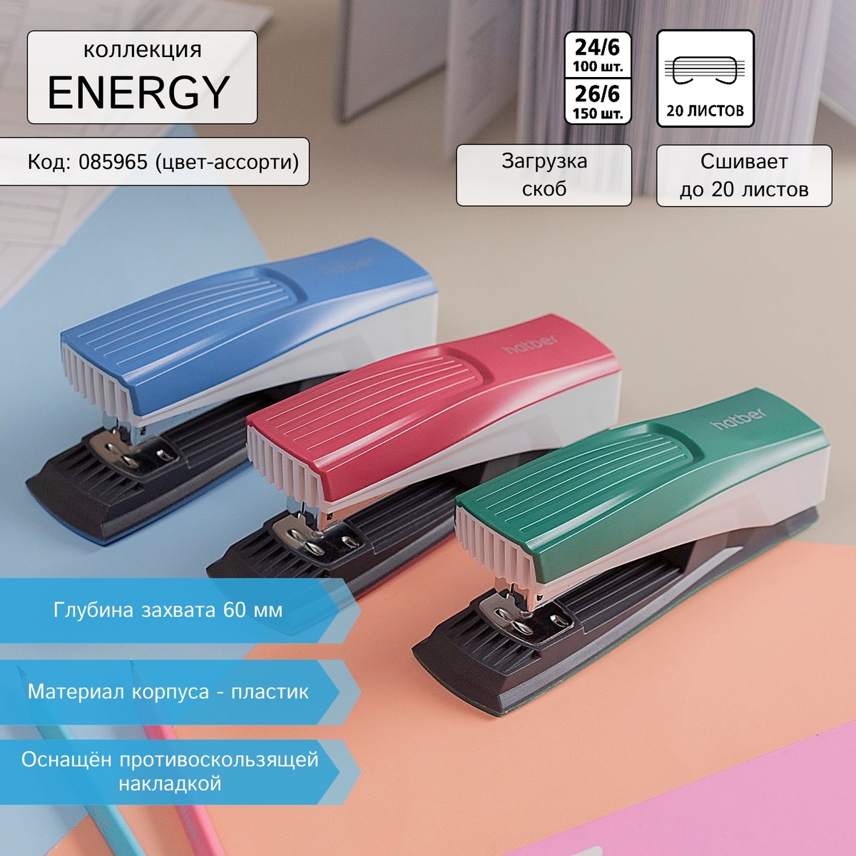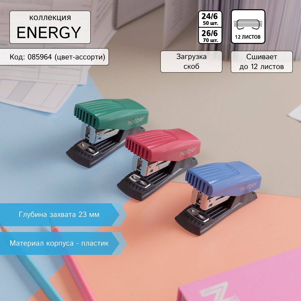 Коллекция Energy от Hatber включает в себя степлеры и дыроколы в элегантном трёхцветном дизайне. Чёрные и белые детали дополнены корпусными частями в насыщенных цветах. В сочетании с металлической основой выглядит очень стильно.