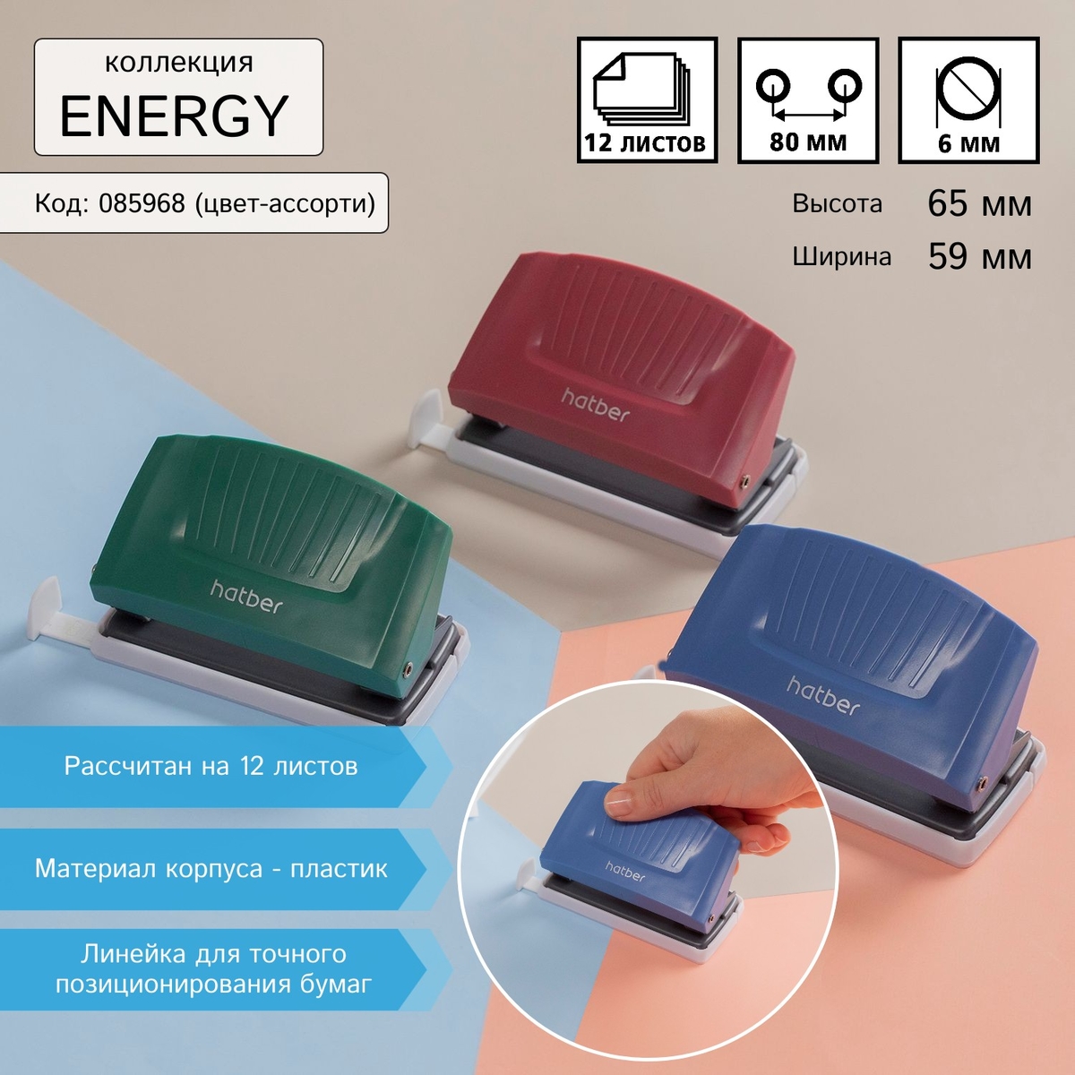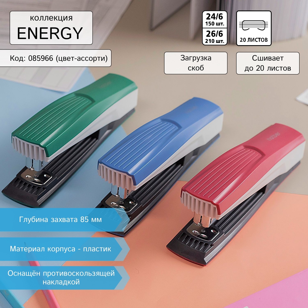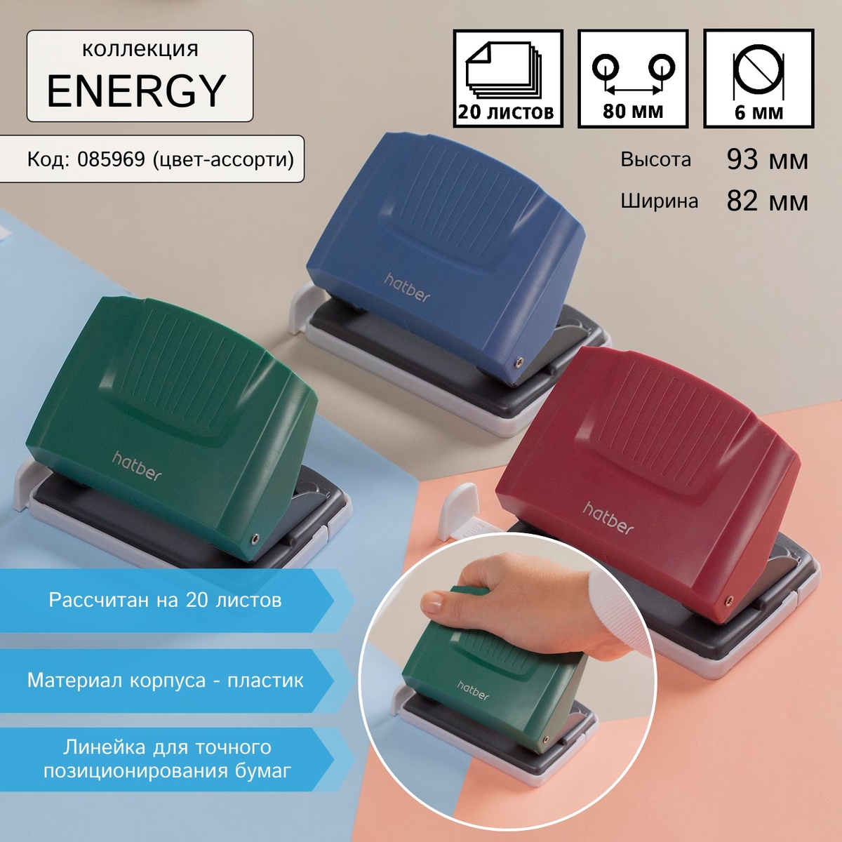 Коллекция Energy от Hatber включает в себя степлеры и дыроколы в элегантном трёхцветном дизайне. Чёрные и белые детали дополнены корпусными частями в насыщенных цветах. В сочетании с металлической основой выглядит очень стильно.