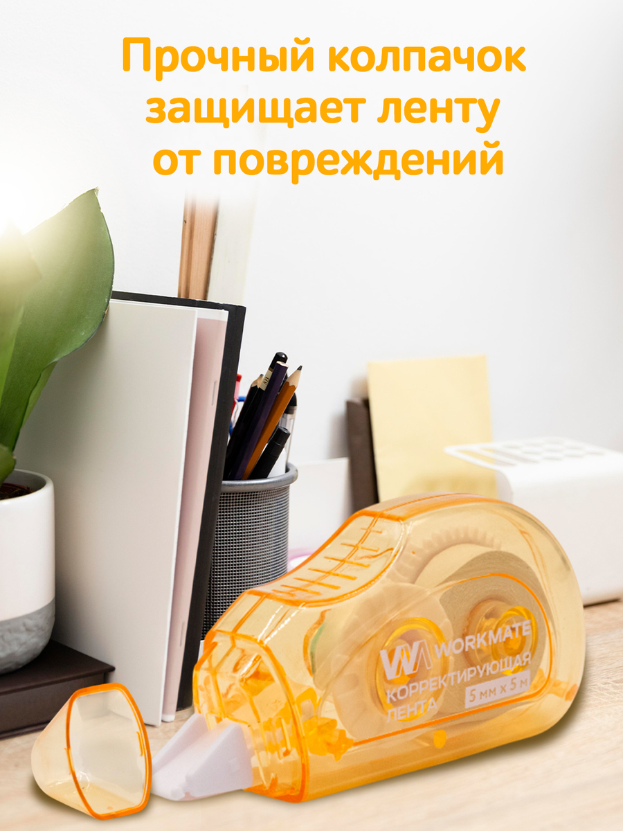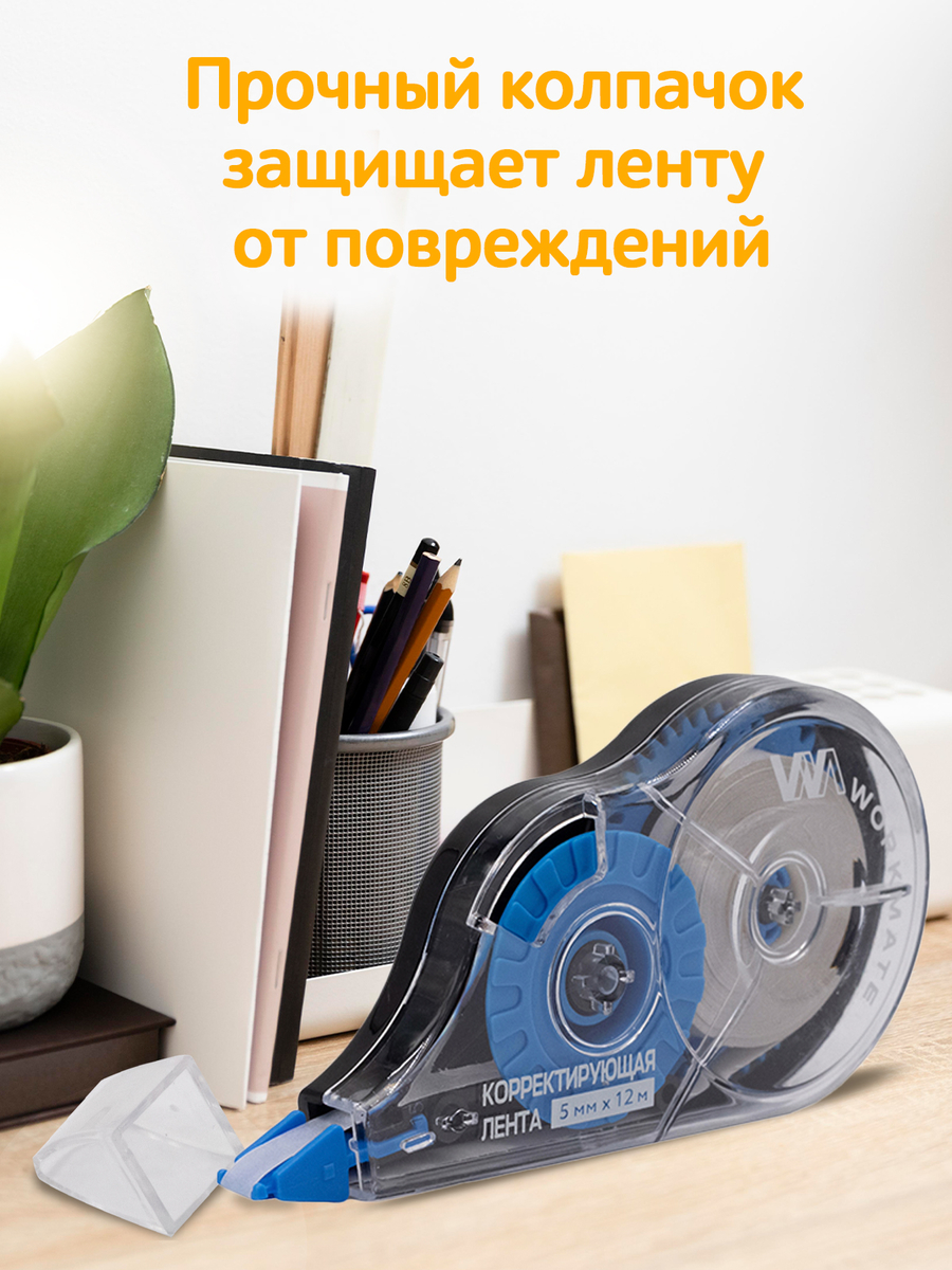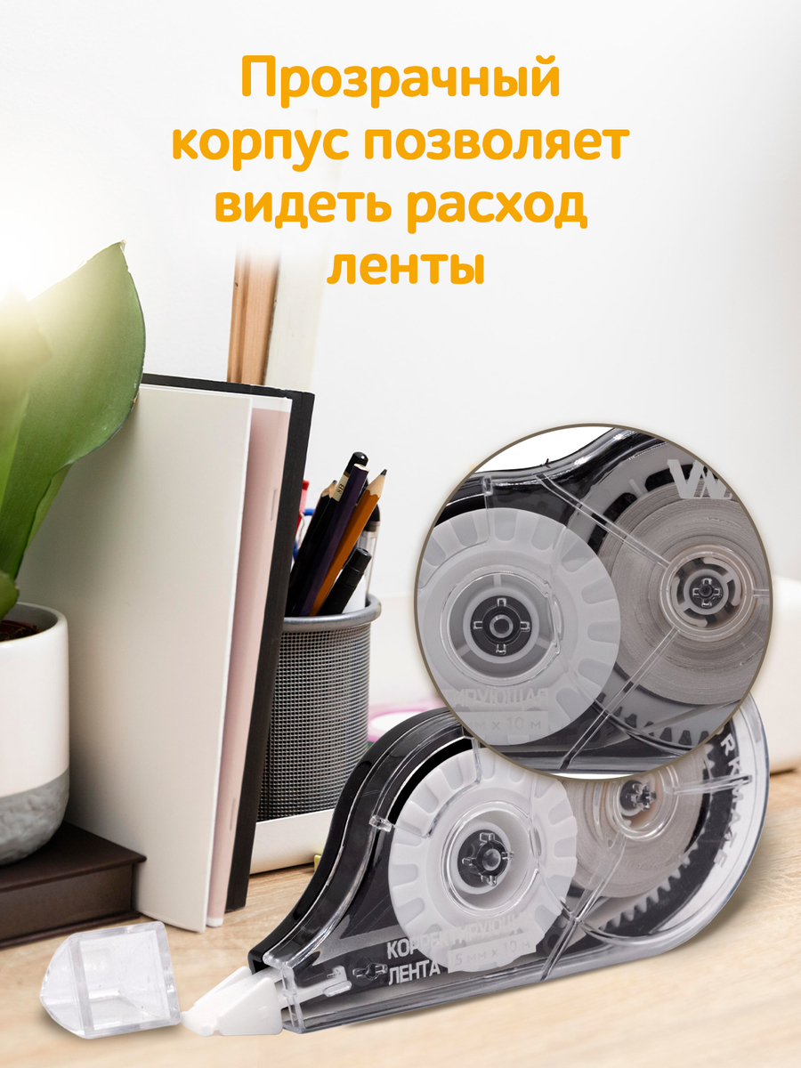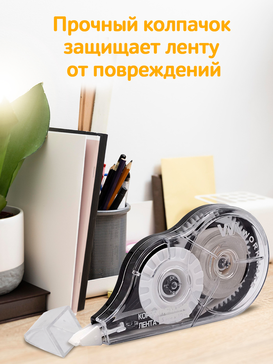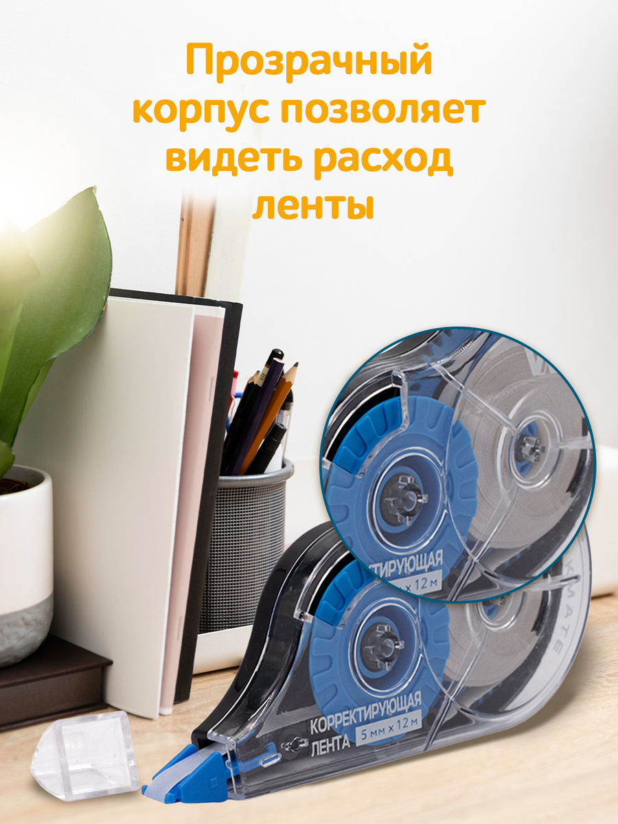 Корректирующая лента для наносится мгновенно, обеспечивая плотное и ровное покрытие с первого касания. Она подходит для любого типа бумаги, позволяя быстро и аккуратно исправлять ошибки. Прочный колпачок надежно защищает ленту, а прозрачный корпус даёт возможность легко контролировать расход. В ассортименте разная длина намотки с шириной полосы 5 мм.