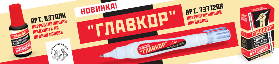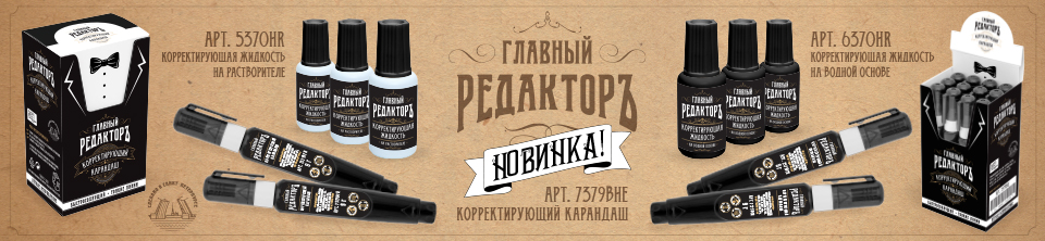 Линейка представлена в бутылочной корректуре на водной основе (артикулы 6370WS «Белая полоса», 6370HR «Главный редактор», 6370HK «Главкор») и на растворителе (артикулы 5370WS «Белая полоса», 5370HR «Главный редактор»), а также в виде корректирующего карандаша (артикул 7379BHE «Главный редактор»).