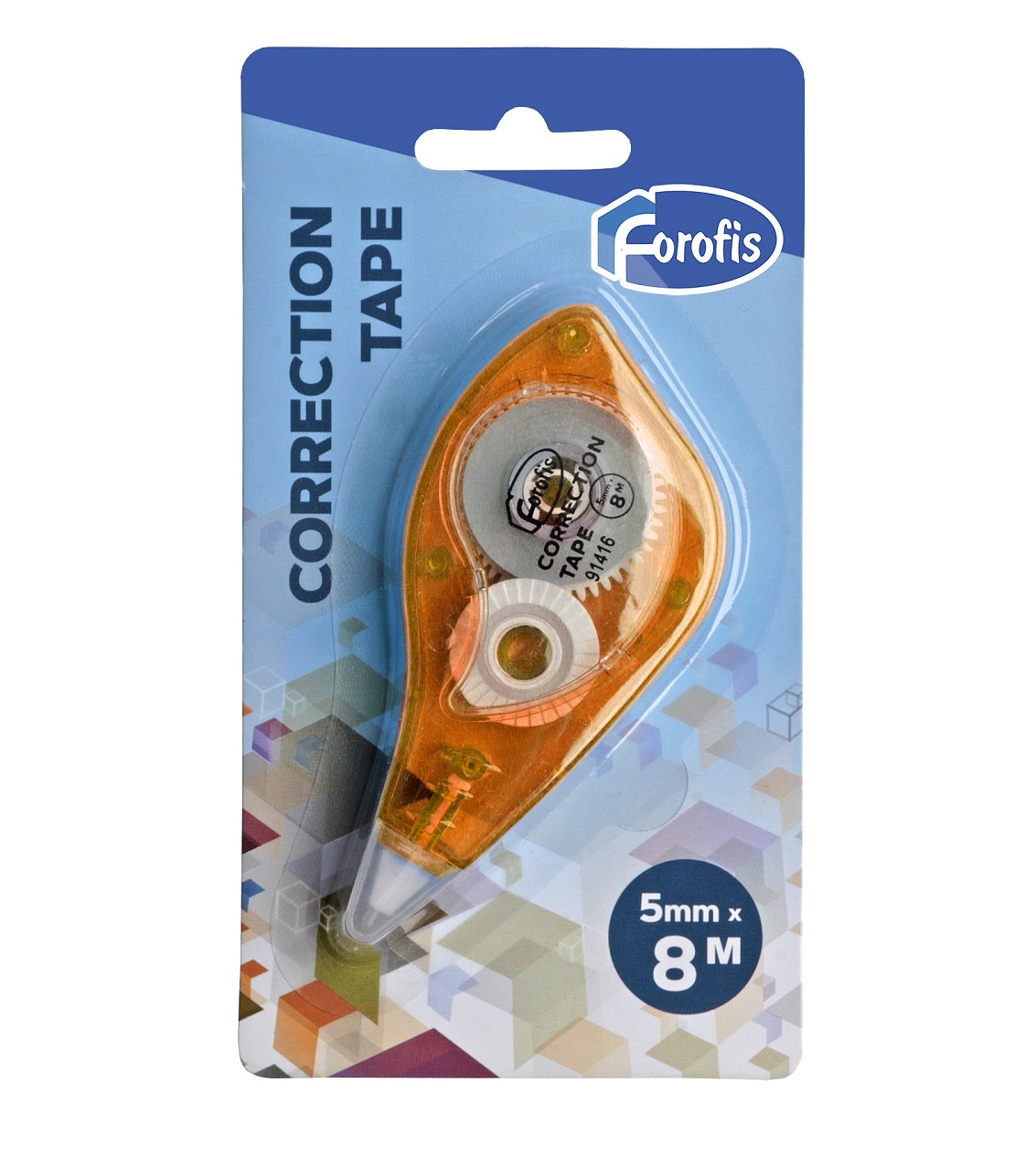 Длина корректирующей ленты — 8 м, ширина — 5 мм. Цвет в ассортименте. Упаковка — блистер с европодвесом.