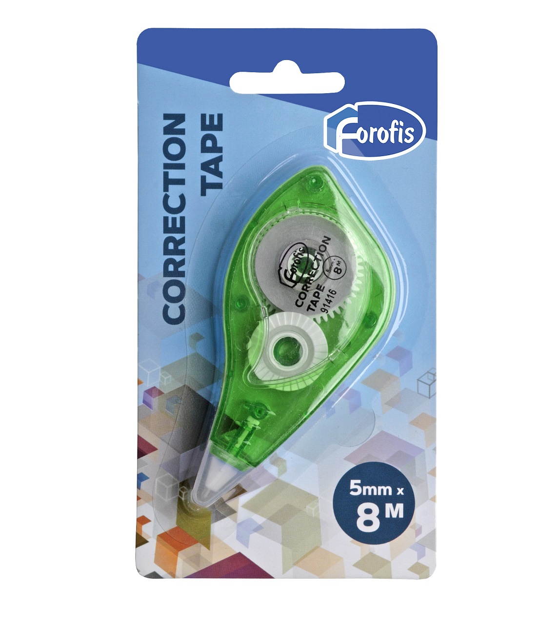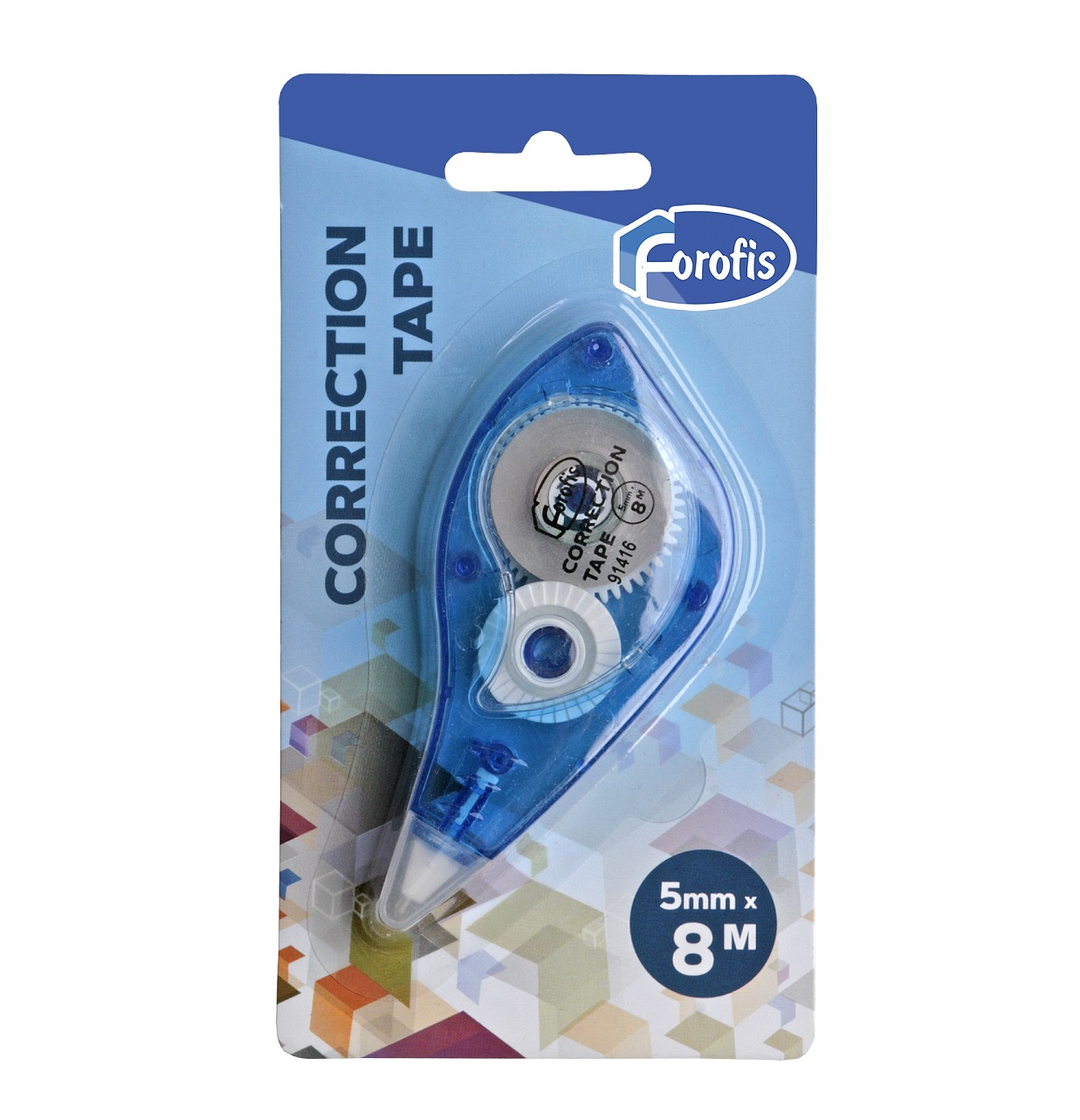 Длина корректирующей ленты — 8 м, ширина — 5 мм. Цвет в ассортименте. Упаковка — блистер с европодвесом.