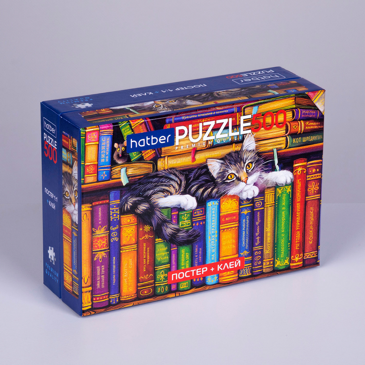 Также на полке красуется книга «Кошки-мышки», которая подчёркивает вечное противостояние между котами и мышами. И здесь же наше внимание привлекает маленький мышонок, с опаской наблюдающий за ленивым хранителем книг — котом, который уютно устроился на полке. Кот же кажется полностью расслабленным и не замечающим, что его потенциальная «жертва» находится всего в нескольких сантиметрах от него. Таким образом, весь пазл наполняется игривым моментом, который делает эту композицию ещё более живой.