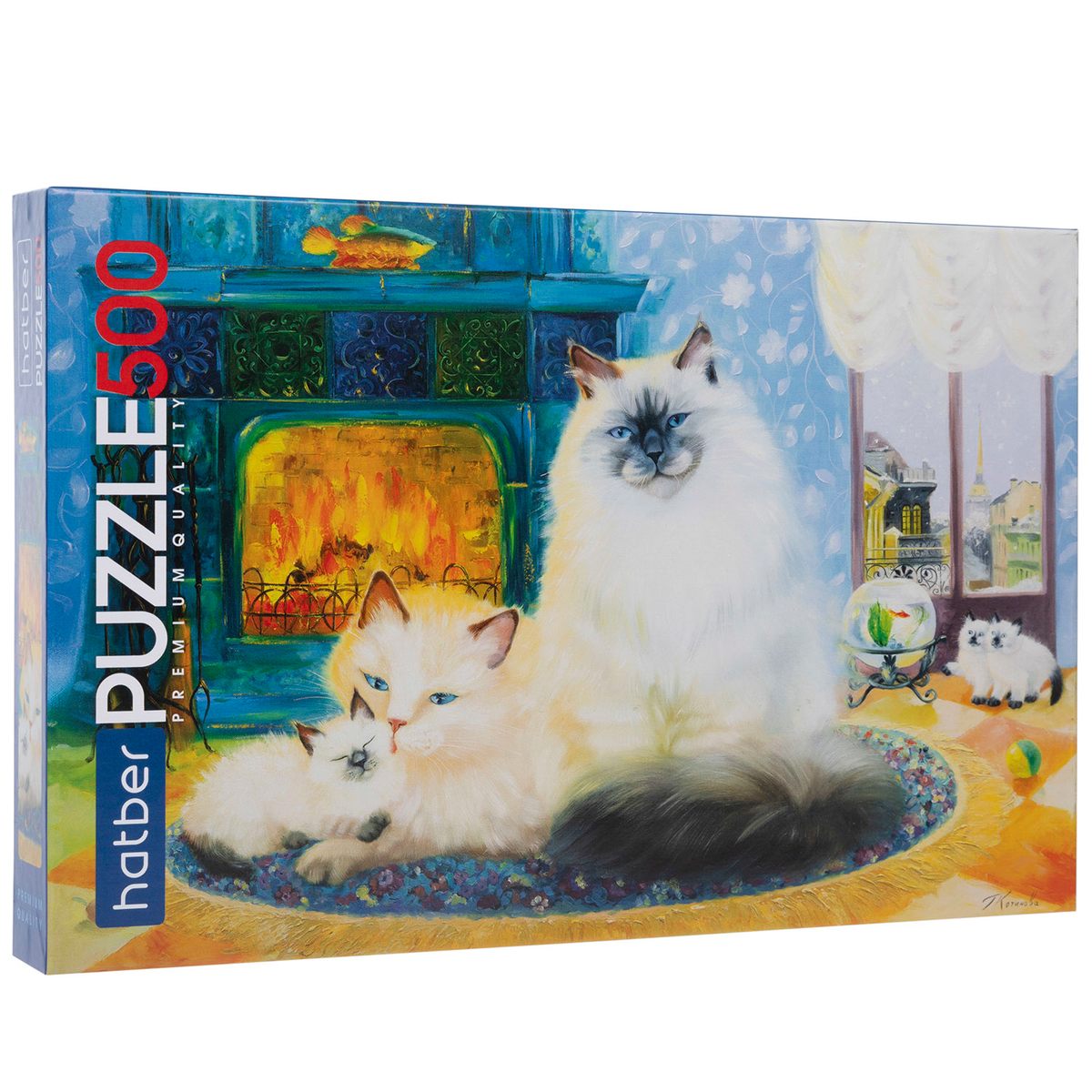 Семейство пушистых зверей уютно расположились на пазле «Кошкин дом». Папа-кот, мама-кошка и один малыш-котёнок нежатся у камина, ещё двое сорванцов забавляются с золотой рыбкой в аквариуме. Милая семейка никого не оставит равнодушными!