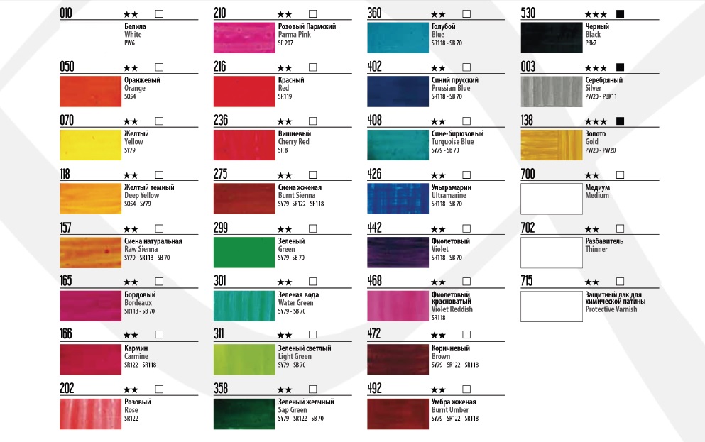Время высыхания составляет 10-12 часов. Представлено 27 различных цветов, медиум для усиления прозрачности и разбавитель. Весь ассортимент выпускается в баночках по 60 мл. Перед нанесением красок поверхность стекла необходимо обезжирить спиртом или мыльным раствором, подойдёт также жидкость для очистки стёкол, — и 13 прозрачных цветов готовы к использованию.