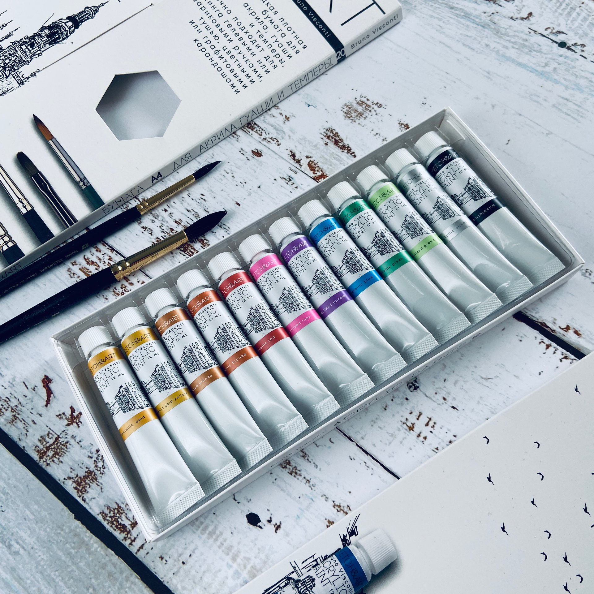 Набор акриловых красок в тюбиках из комбинированного материала (полиэтилен, алюминий) профессионального качества предназначен для художественных и оформительских работ, прикладного искусства и детского творчества. Краски применяются для работы по бумаге, картону, холсту, керамике, гипсу, бетону и другим материалам. Их можно использовать для имитации акварели, гуаши, масляных красок. Они легко смешиваются друг с другом в любых вариантах.