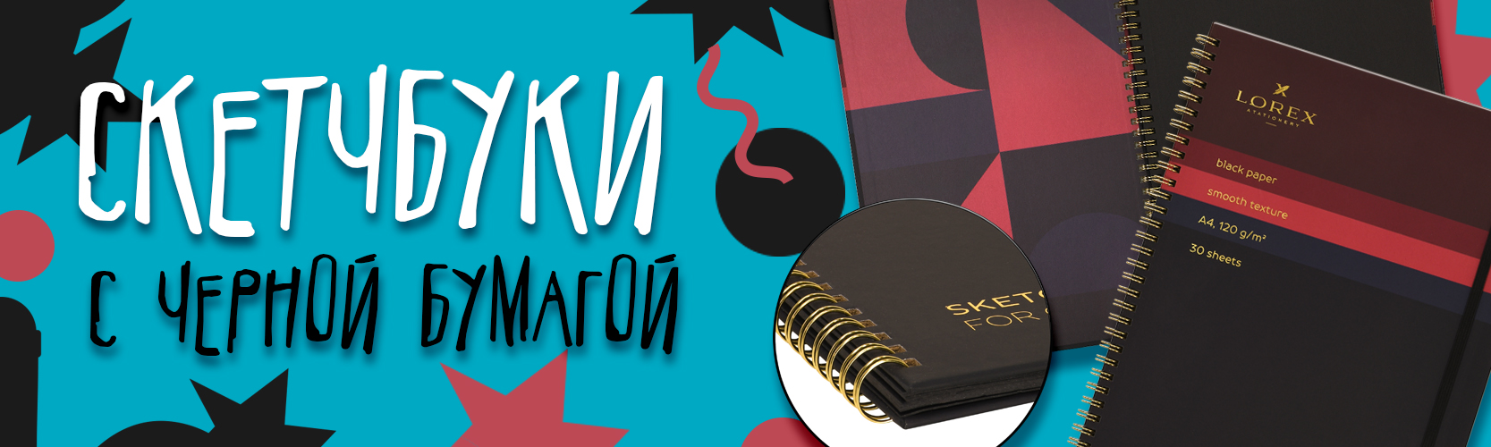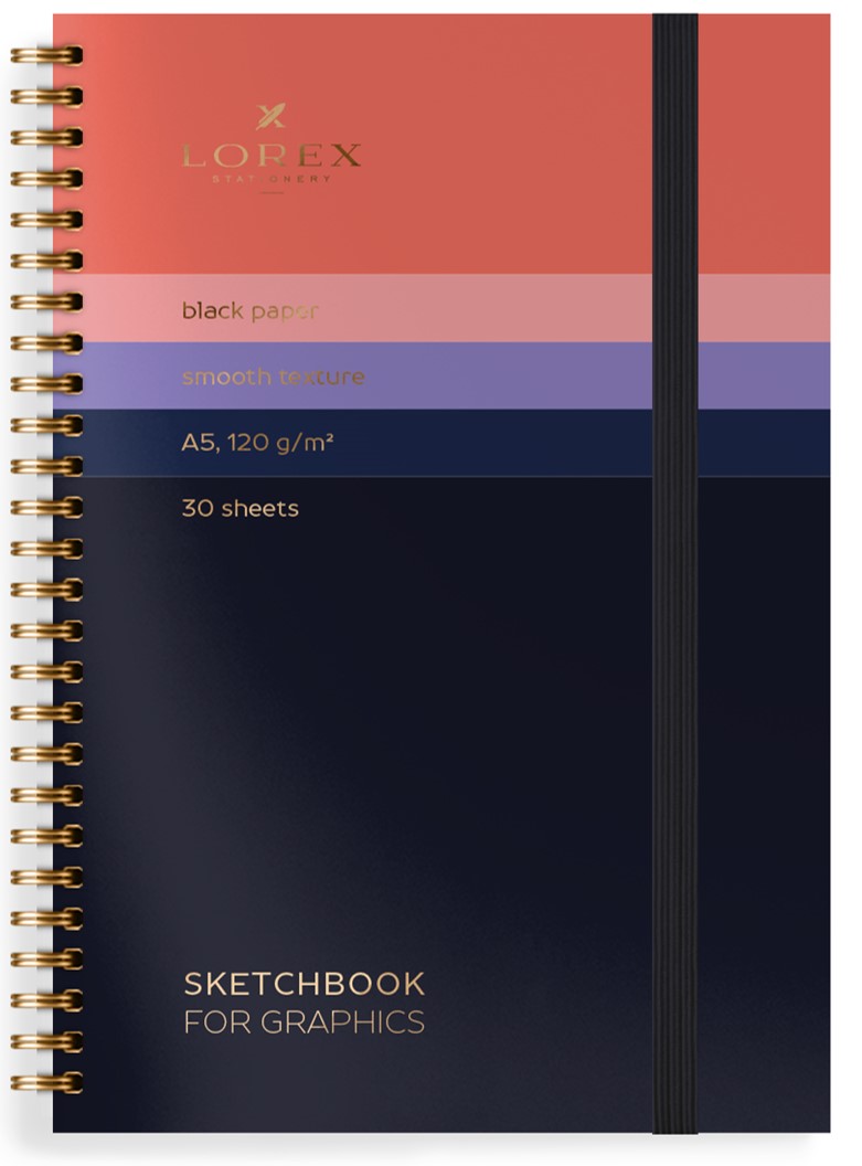 В скетчбуках с черной бумагой неординарная зарисовка станет произведением искусства, художники создают рисунки с помощью белых гелевых ручек и маркеров, и цветных карандашей. В коллекции LOREX два скетчбука в форматах А4 и А5 с 30 листами чёрной бумаги плотностью 120 г/кв. м.