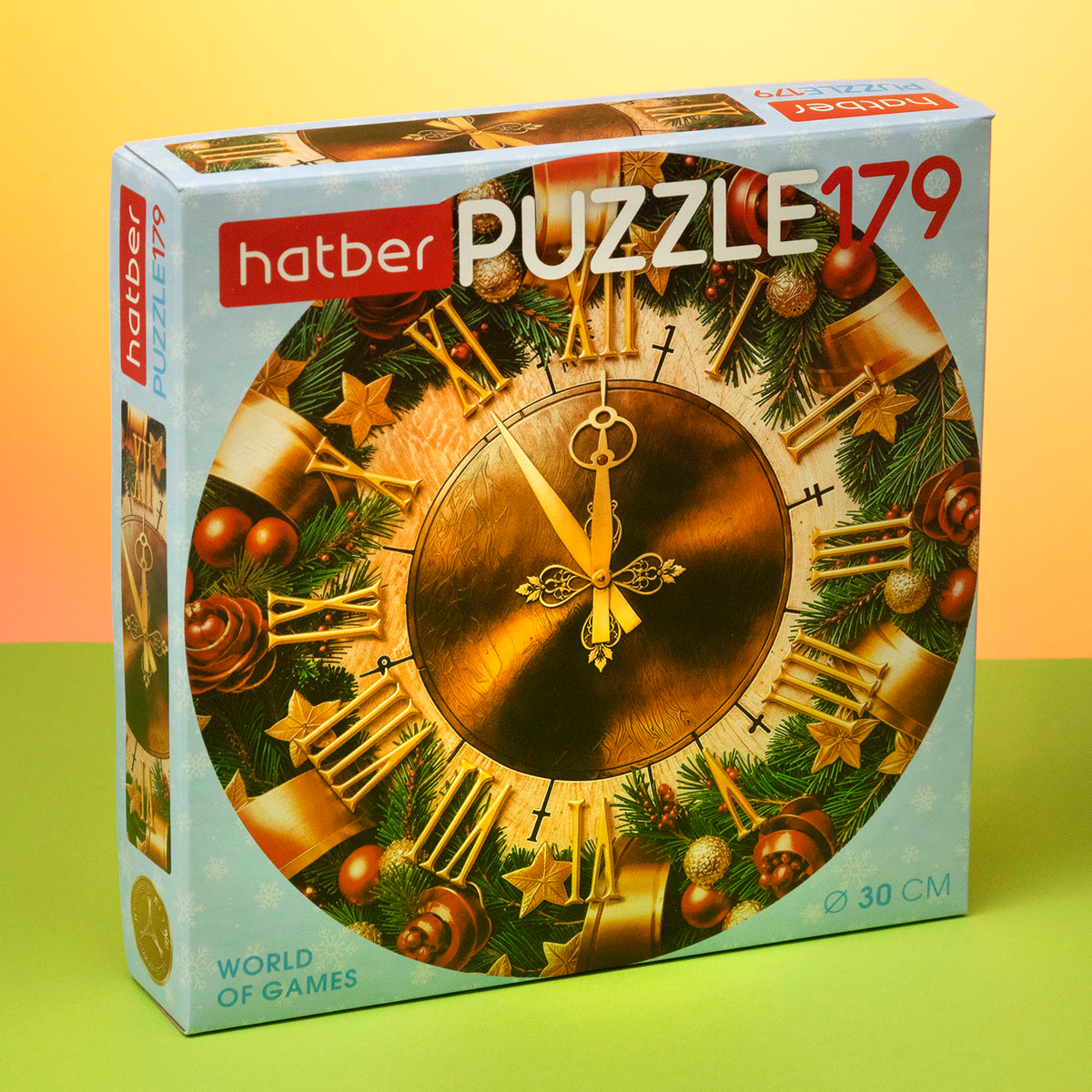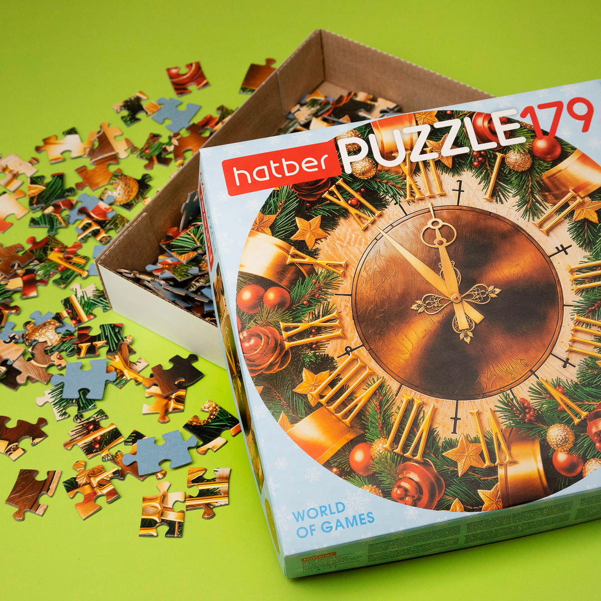 Вторая новинка перенесёт вас в Новый год и напомнит, что время не ждёт, и уже скоро мы будем знакомить вас с новогодней коллекцией! Пазл «Часы» оформлен в новогодней стилистике. В центре расположены часы, обрамленные еловыми ветвями, придающими ощущение зимнего волшебства. Золотые стрелки и элегантные цифры, блестящие на циферблате, добавляют элемент торжественности. Вокруг часов размещены новогодние игрушки, которые словно весело играют в прятки среди зелени.