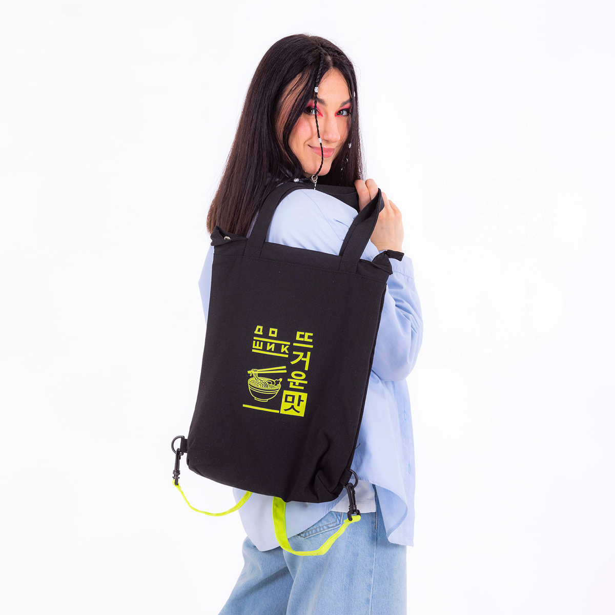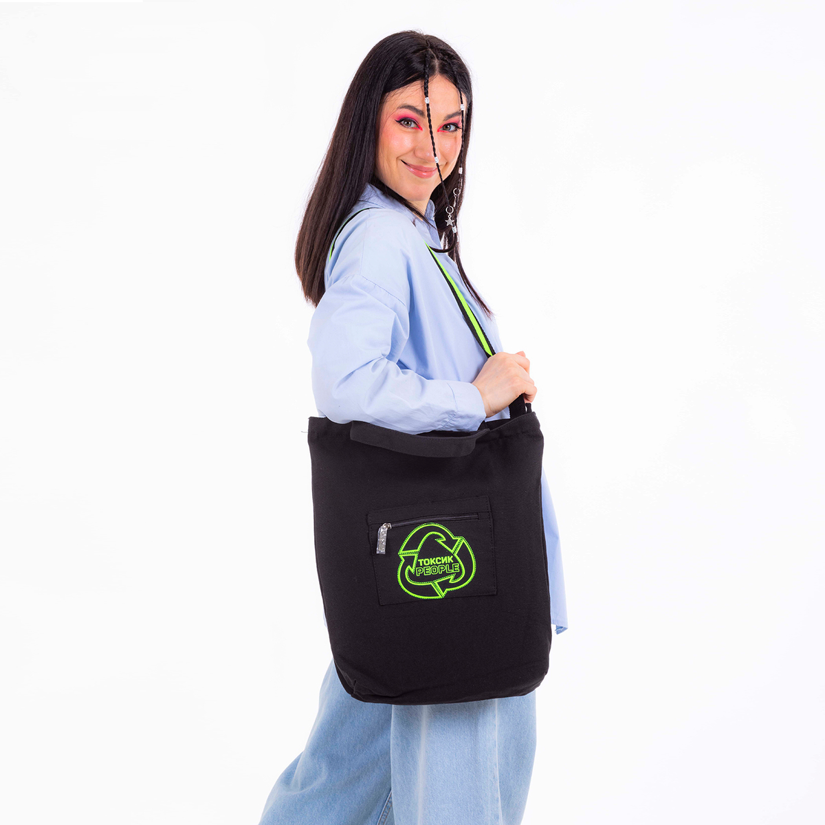 Долой пакеты — Hatber за экологичный подход. А потому предлагает три крутых хлопковых шопера с ярким кислотным дизайном на черном фоне. Топчик для молодёжного весеннего лука!