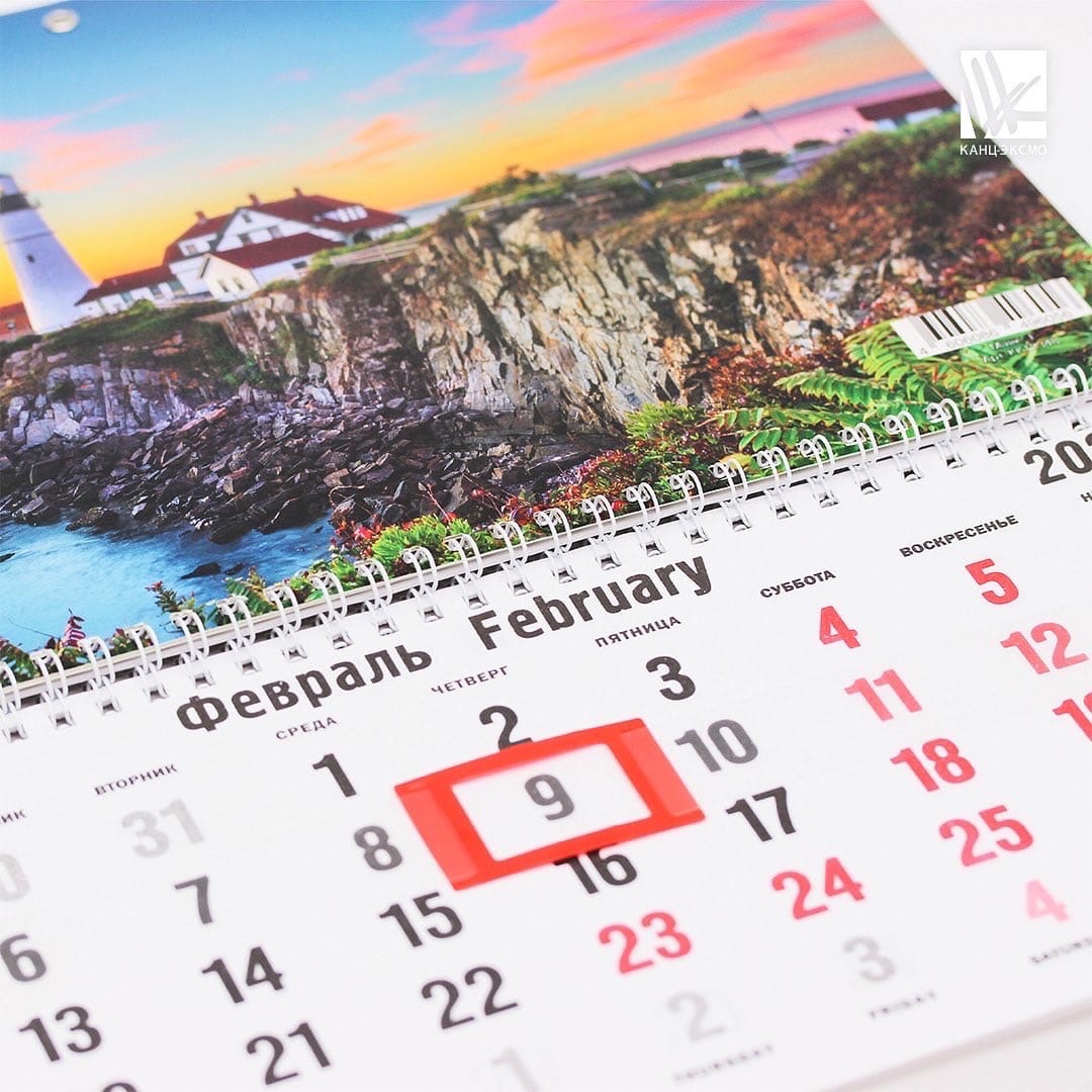 Календарь большого размера (305мм*680 мм), состоит из трёх блоков на евроспиралях, каждый блок — это отдельный месяц, который позволяет без перелистывания видеть даты предыдущего и будущего месяца и вести среднесрочное планирование в рамках квартала (3 месяца).