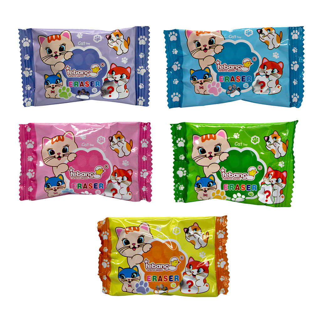 Каждый ластик имеет индивидуальную упаковку. Цвет упаковки соответствует цвету ластика. Упаковка — фирменный картонный стенд.