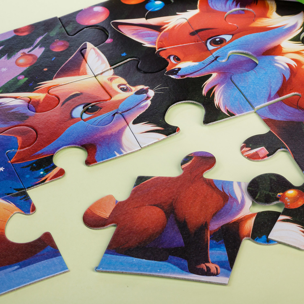 Забавные, рыжие лисички с пушистыми хвостами бегают вокруг ёлки, ждут гостей и, видимо, хотят узнать, сколько подарков можно утащить. Пазл собирается быстро, и вы и ваш малыш можете наслаждаться процессом без усталости, но с результатом, который точно подарит радость зимнего волшебства.