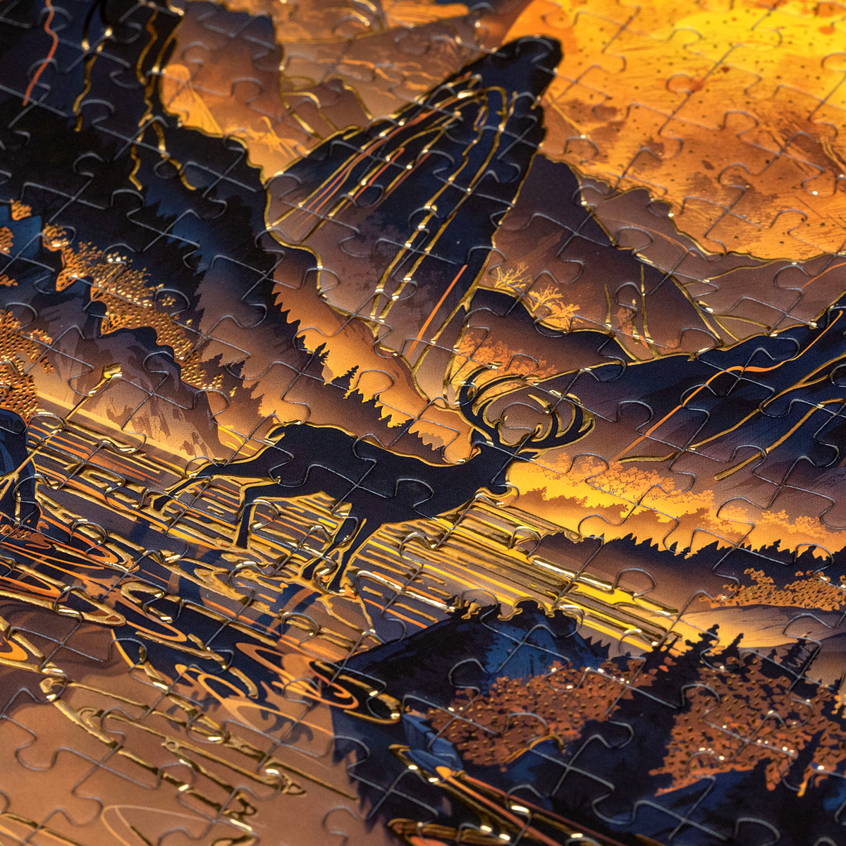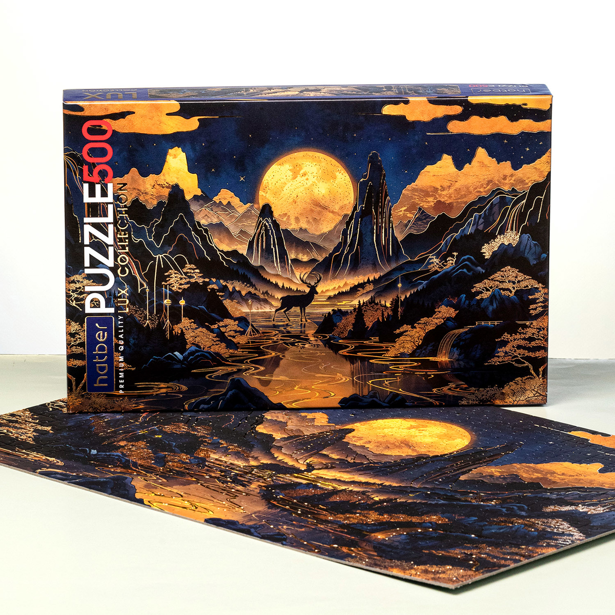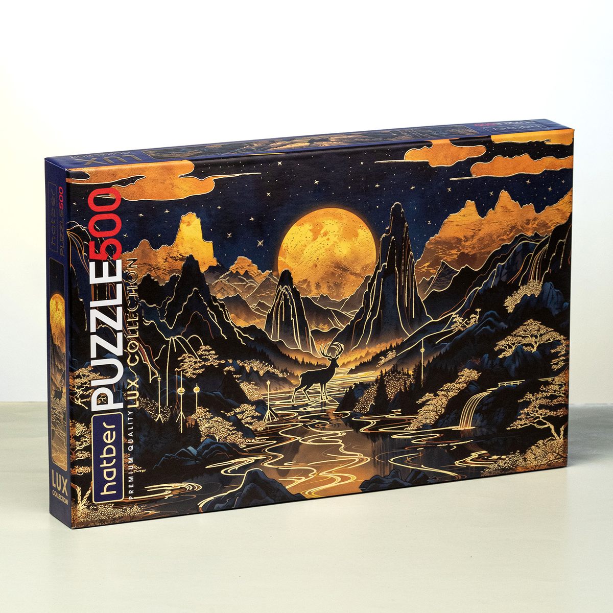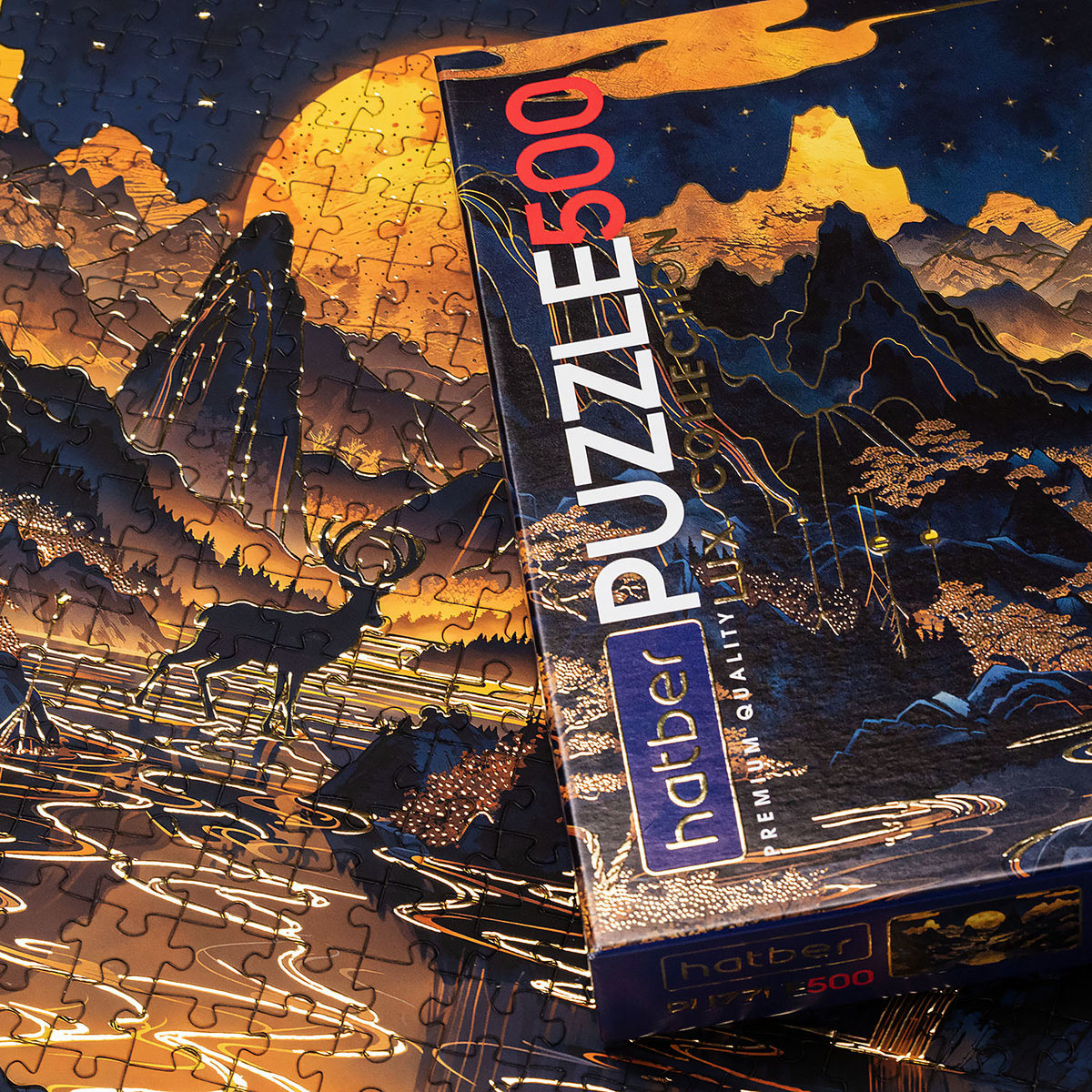 Луна горит, будто её расписал художник и покрыл золотой пылью, а река словно течёт золотыми нитями. Застывший олень в центре картины добавляет сцене жизни, а тени гор создают ощущение глубины и покоя. Матовая ламинация и 3D-фольга делают каждый элемент уникальным, будто свет в этом пазле живёт на самом деле.