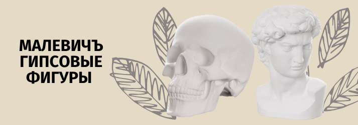 На сайте «Комус ОПТ» появились новые гипсовые фигуры «Малевичъ» в виде головы Давида, анатомического черепа, амфоры, шара и др.