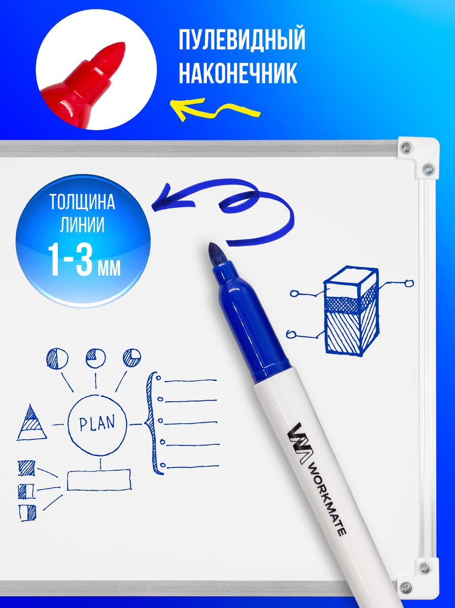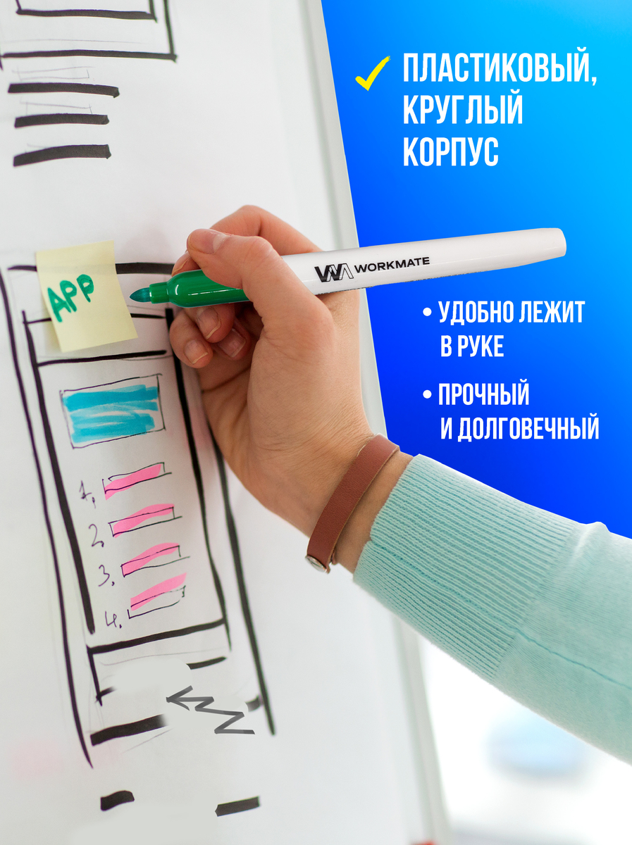 Разработанные для универсального применения на любых гладких поверхностях — магнитных досках, флипчартах, пластиковых панелях, маркеры Workmate станут надежным помощником в самых разных сферах — от обучения и планирования, до оформления меню в кафе и ресторанах.