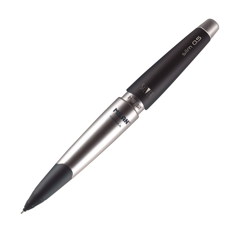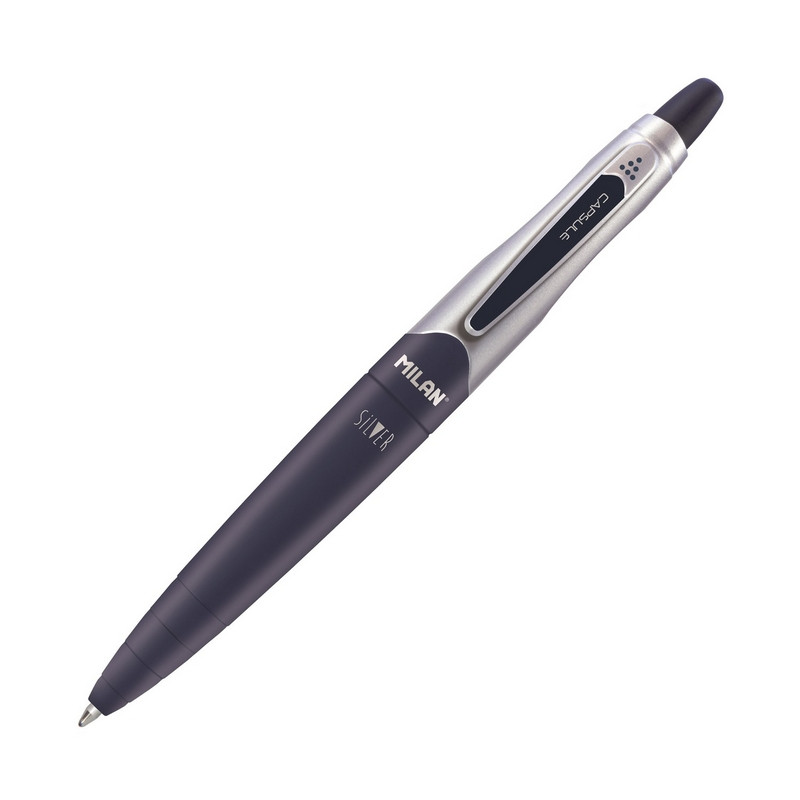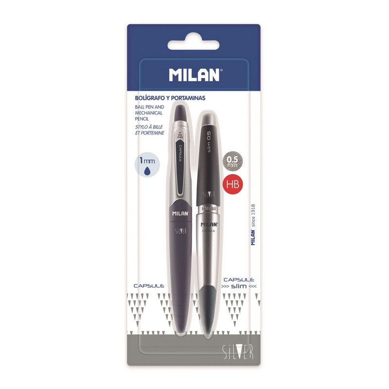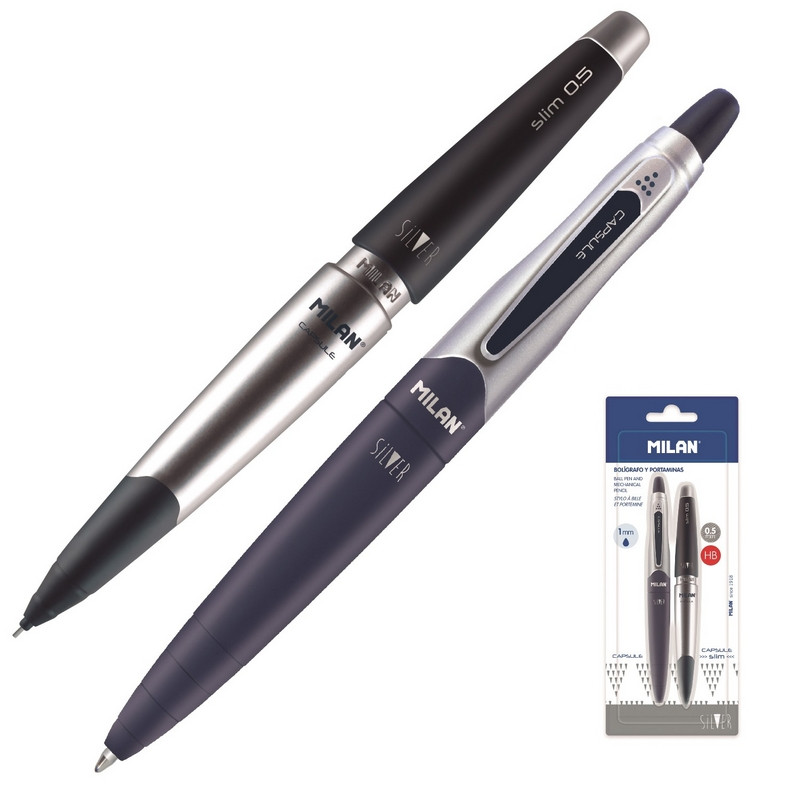 Карандаш и автоматическая ручка Milan коллекции Capsule Silver Slim имеют серебристый цвет средней части корпуса в сочетании с тёмно-синим цветом нижней и верхней частей. У карандаша также имеются запасные стержни и ластики. У ручки длина письма — 1200 метров. Толщина стержня — 1 мм. Чернила производства Германии, кнопочная подача стержня. Система подачи чернил обеспечивает мягкое письмо без пропусков.