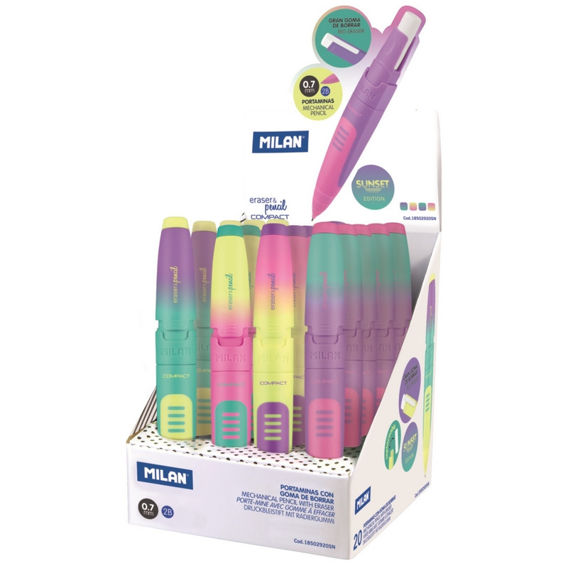Milan Compact Sunset — механический карандаш и выкручивающимся ластиком, позволяющий удалять различный тип графита с поверхности бумаги любых сортов. Оригинальный дизайн с плавно переходящими цветами создан собственным отделом исследований и разработок Milan. Толщина грифеля — 0,7 мм, твёрдость — HB.