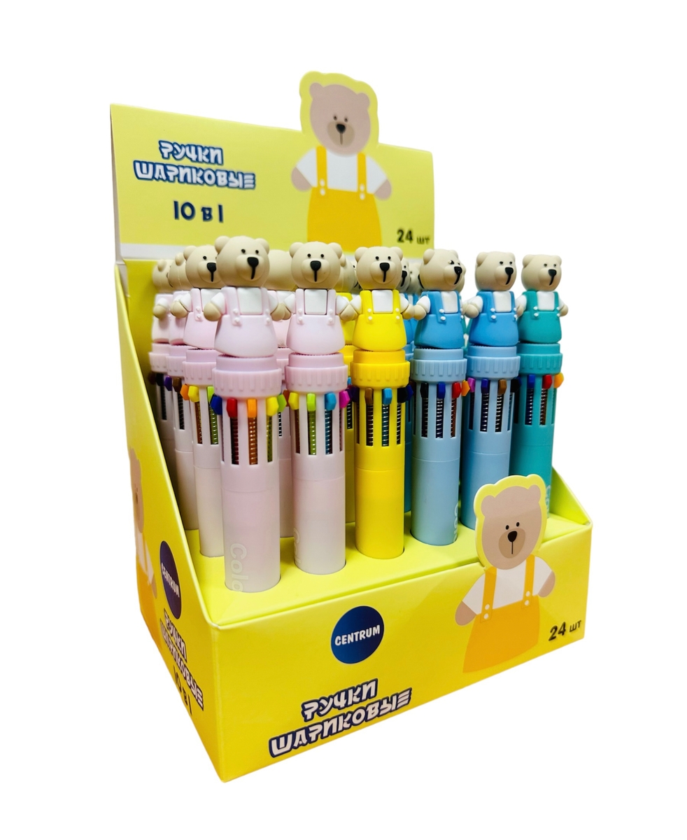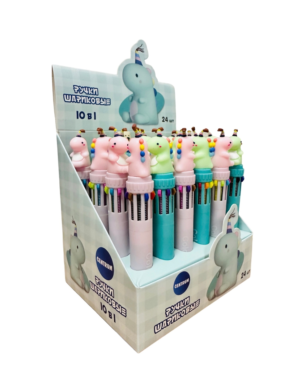 Centrum представляет многоцветные шариковые ручки в креативном исполнении. Круглый пластиковый корпус с бархатистым покрытием soft-touch дополнен резиновой фигуркой, не утяжеляющей инструмент. Автоматические модели удобны в использовании, экономят место в пенале или на рабочем столе, позволяют всегда иметь под рукой набор основных цветов для письма и выделения записей.
