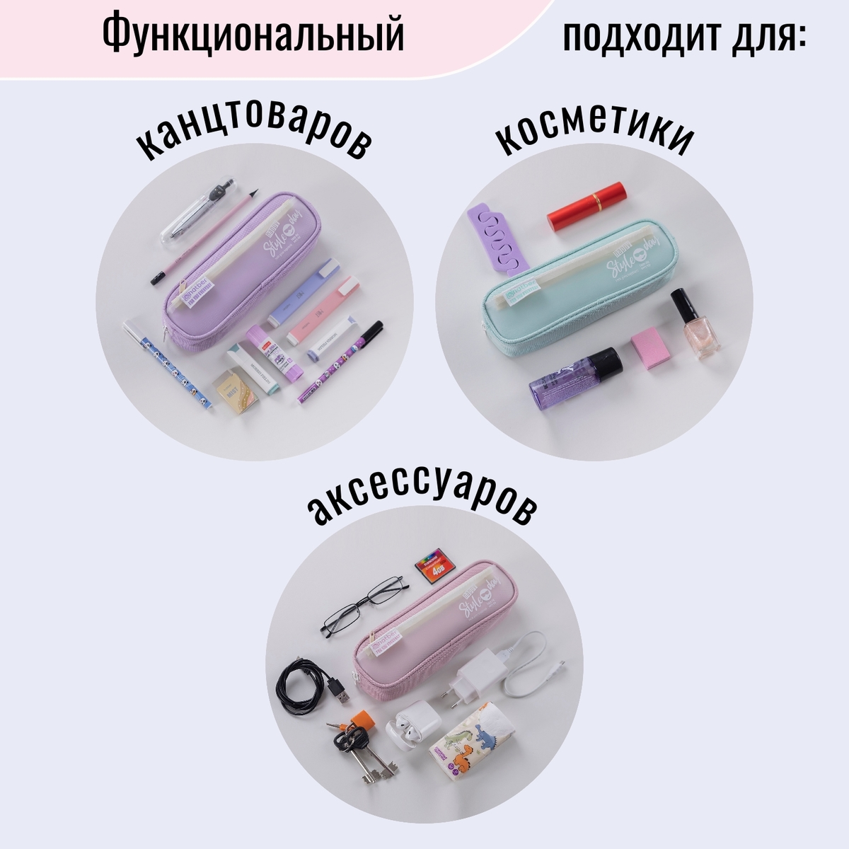 Мятный, лавандовый, пыльно-розовый пеналы со скруглёнными уголками мягко держат форму, не занимают много места в сумке, но в то же время вместительные. Они послужат домом не только для письменных принадлежностей, но легко станут косметичкой, будут удобны в дороге и путешествиях.