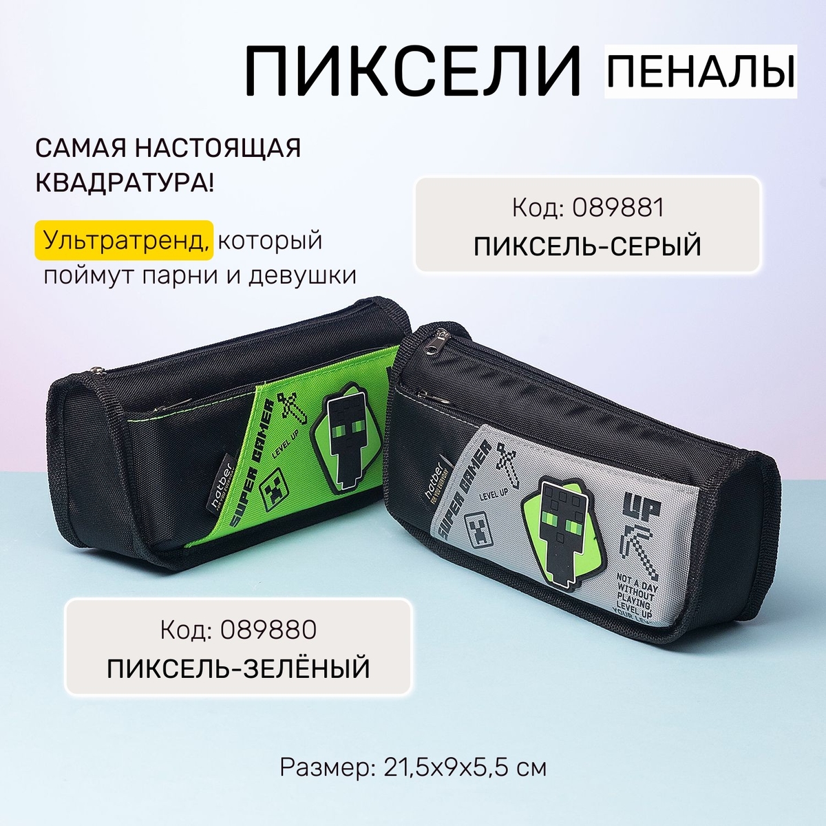 «Пиксели» Самая настоящая квадратура! На чёрном фоне угловатое, пиксельное напоминание про НПС-персонажей популярной игры в жанре песочницы. Настоящий ультратренд, который поймут парни и девушки. Пеналы изготовлены в двух цветовых вариантах: сером и зелёном.
