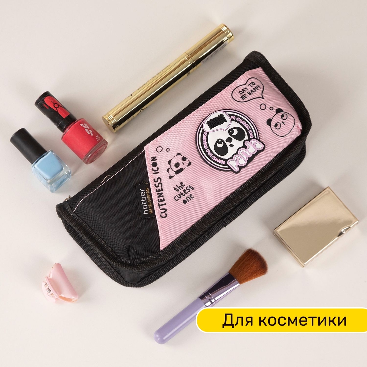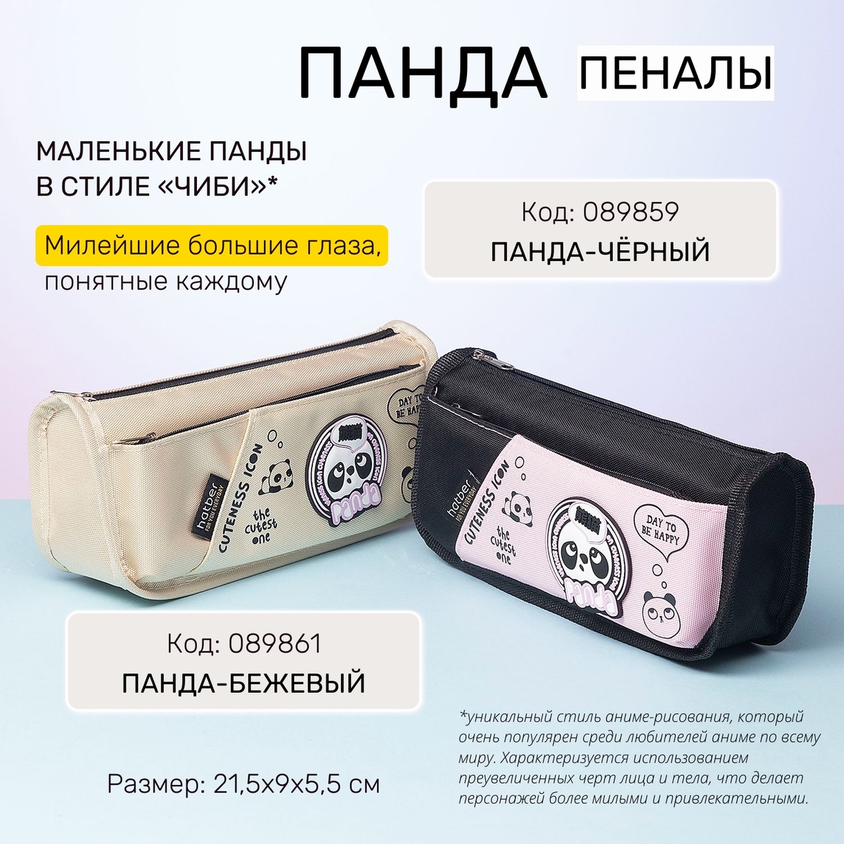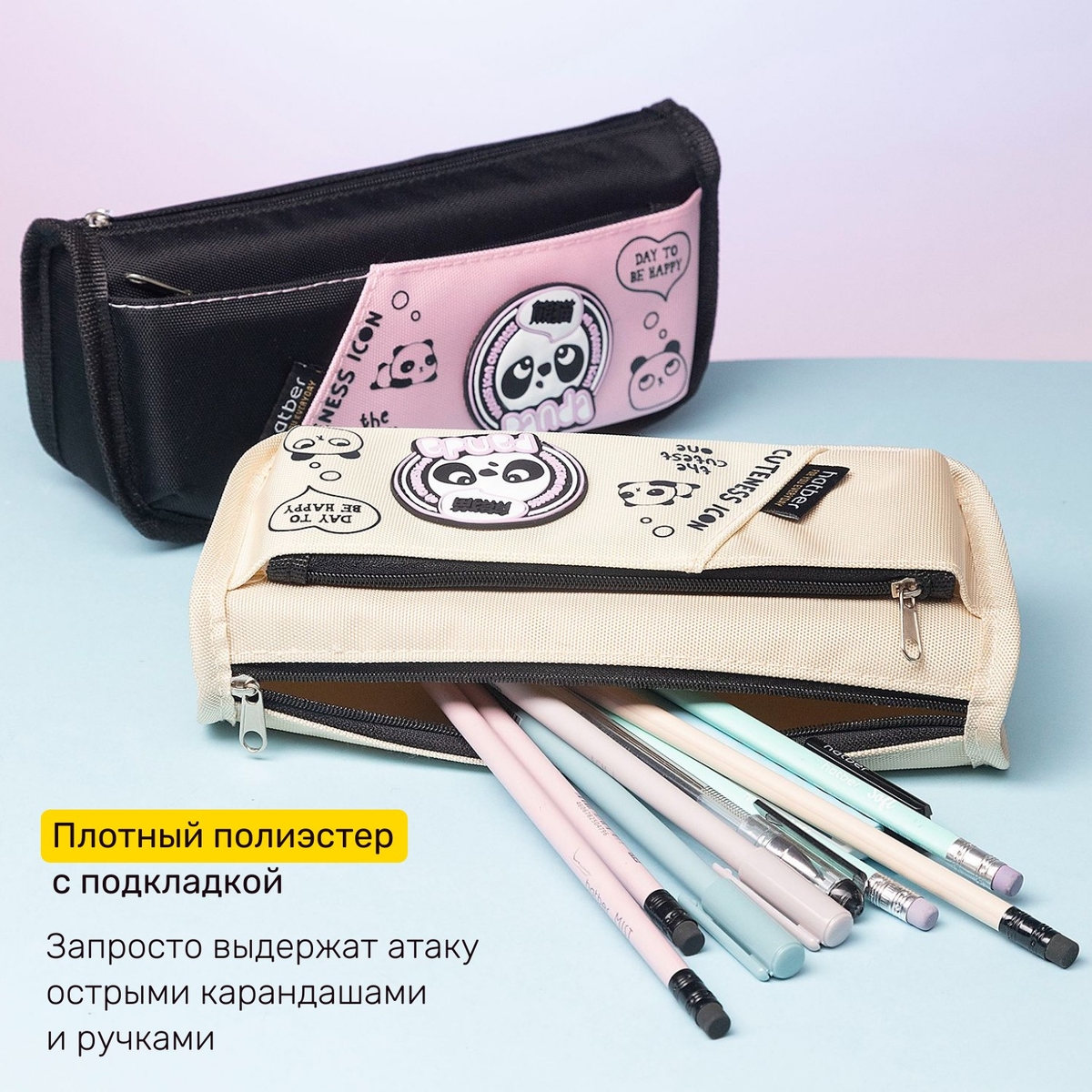«Панды» Лаконичный, универсальный дизайн, в котором есть всё, что соответствует мимимишности: маленькие панды в стиле «чиби», милейшие большие глаза, округлый рукописный шрифт и добрые смыслы, понятные каждому. Пеналы изготовлены в бежевом и чёрном вариантах.