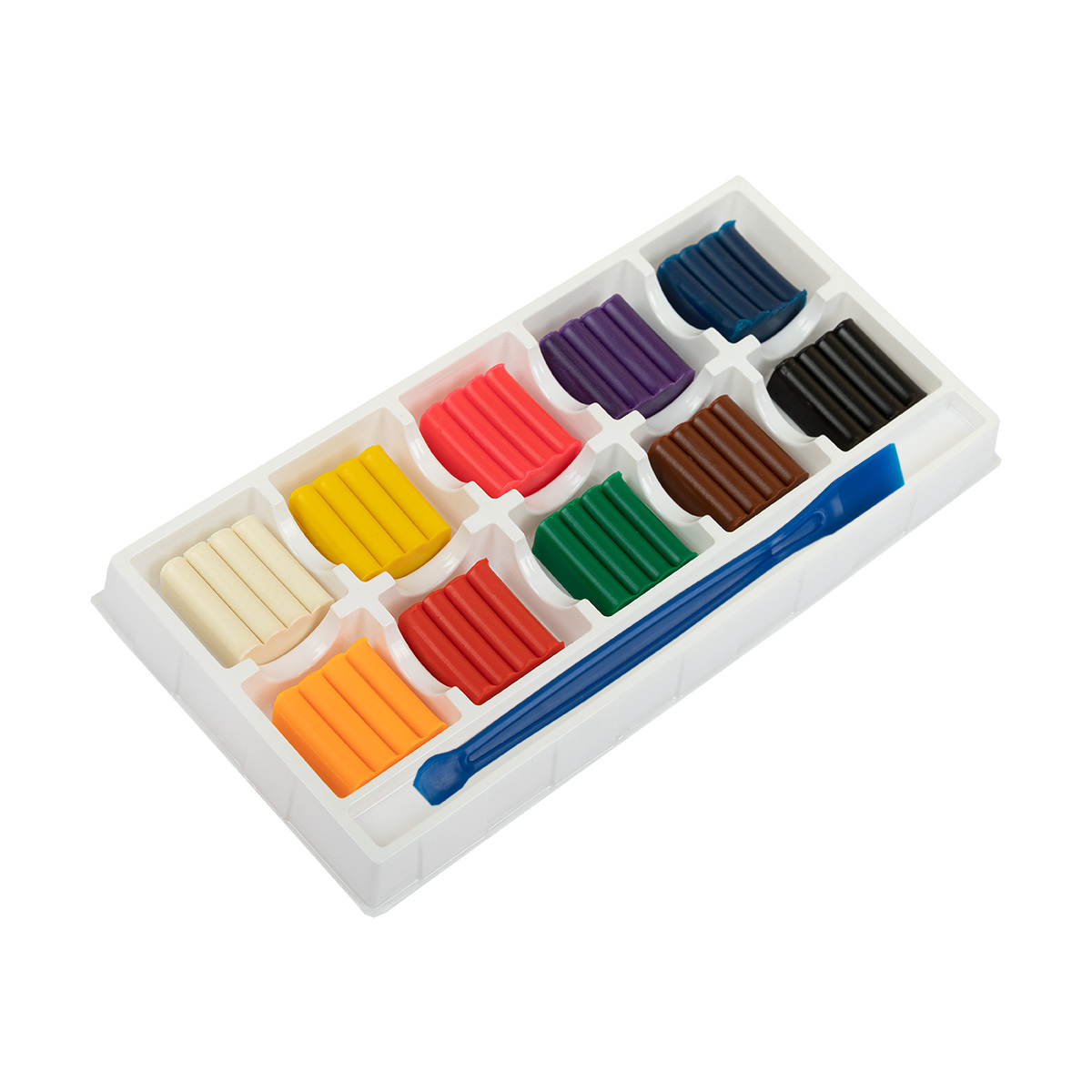 В упаковке десять брусков разных цветов: белого, жёлтого, оранжевого, алого, розового, фиолетового, синего, зелёного, коричневого и чёрного. Надёжный пластиковый разделитель внутри предотвратит их склеивание между собой. Каждый набор дополнен специальным стеком для лепки.