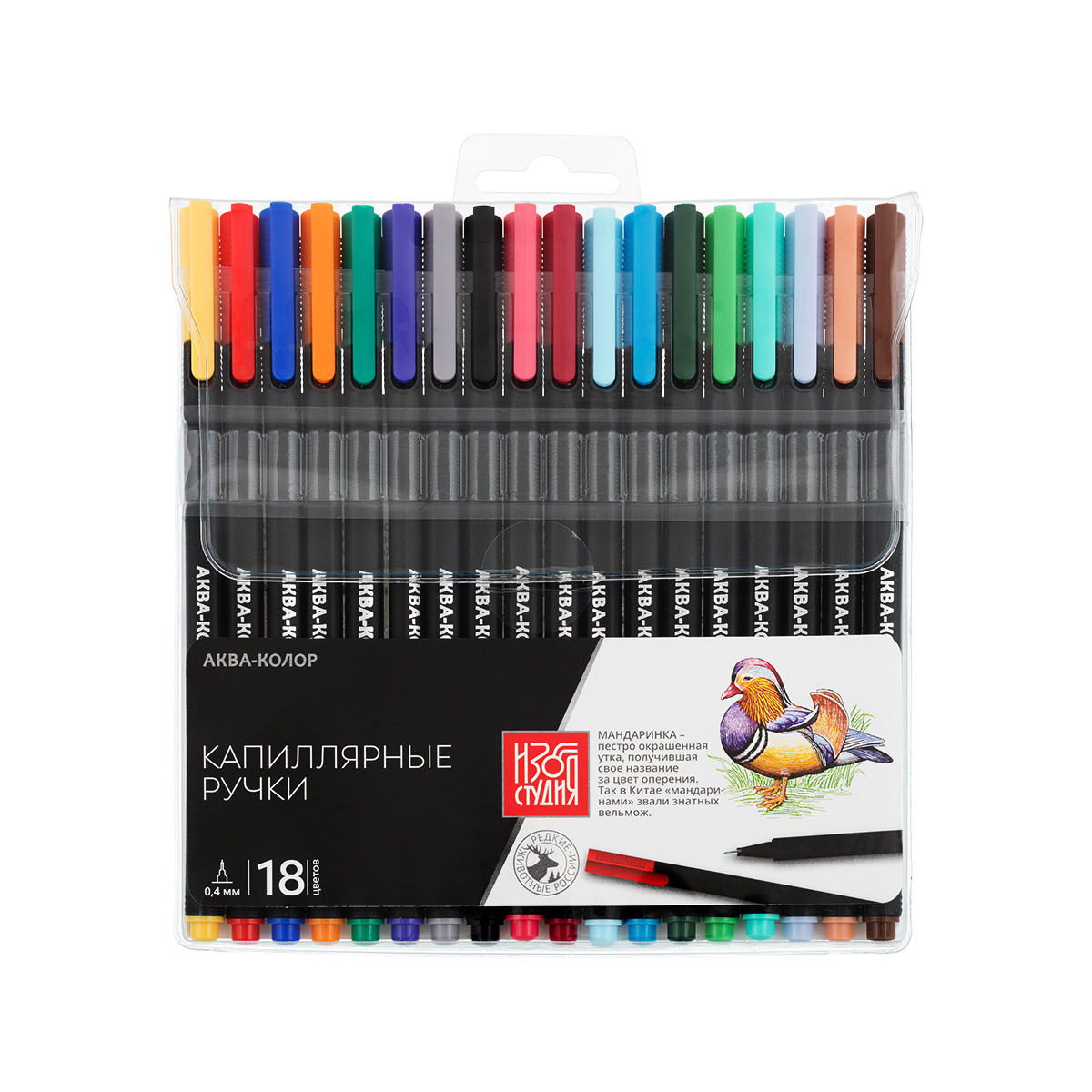 Ручки «Аква-колор» предназначены для графических и художественных работ. Собраны в наборы по 12, 18, 24 цв. Отлично подходят для скетчинга, иллюстраций, работ в смешанных техниках, рисования мандалы. Диаметр наконечника — 0,4 мм.