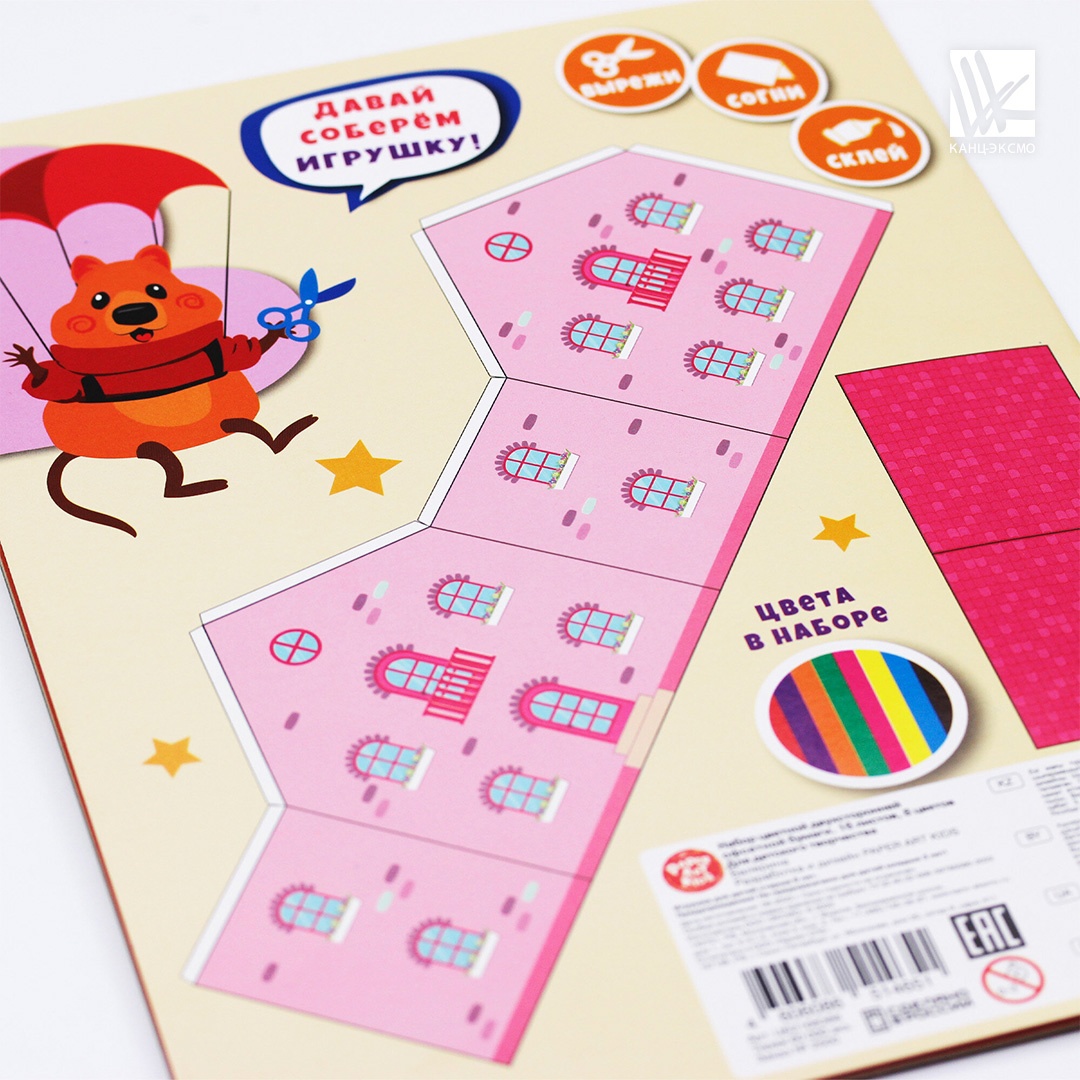 Набор двухсторонней цветной бумаги из 16 листов от компании «Эксмо» отличается качественным наполнением: 16 листов офсетной бумаги в стандартной цветовой гамме, которые отлично сгибаются и не оставляют заломов, хорошо прокрашены, имеют яркие и насыщенные цвета, а на упаковке привлекательные иллюстрации. На обороте набора содержится занимательная игра «Собери игрушку» (фигура для вырезания и склеивания), которая делает набор развивающей продукцией для детей.
