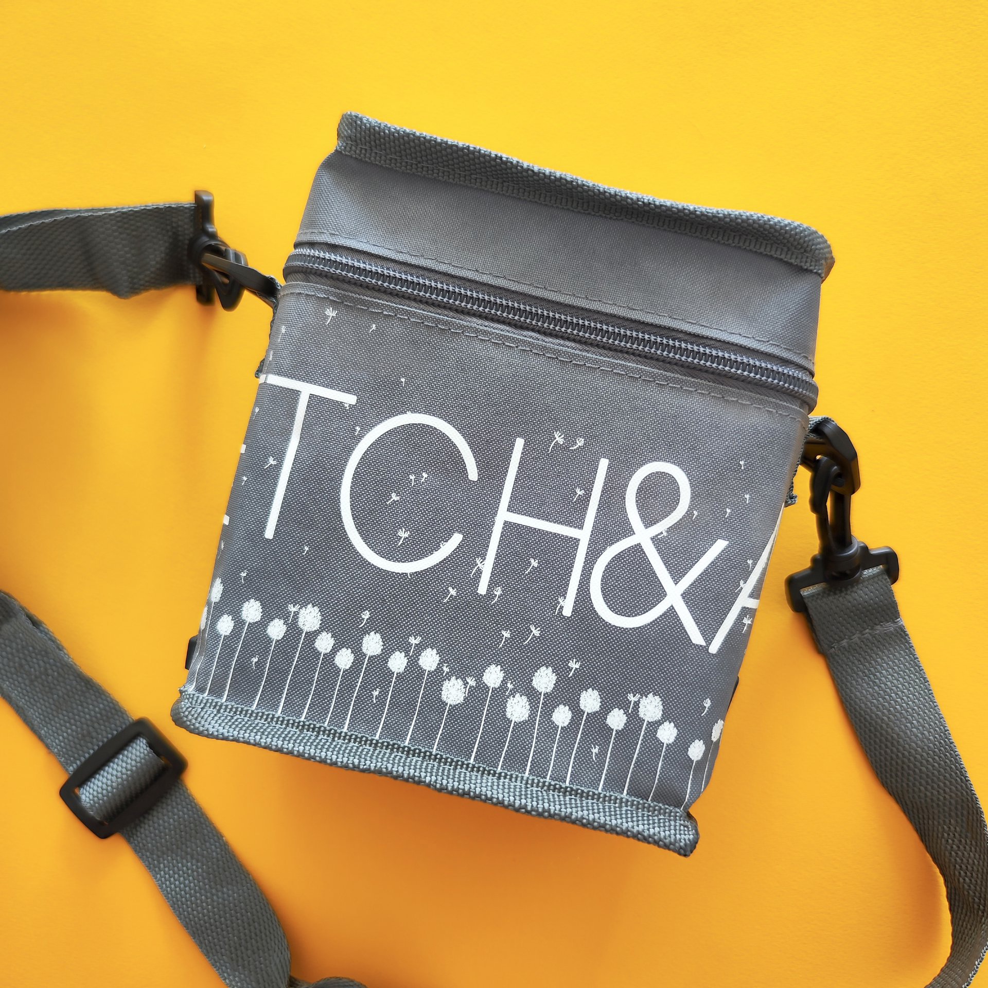 В текстильной сумке с плечевым ремнем