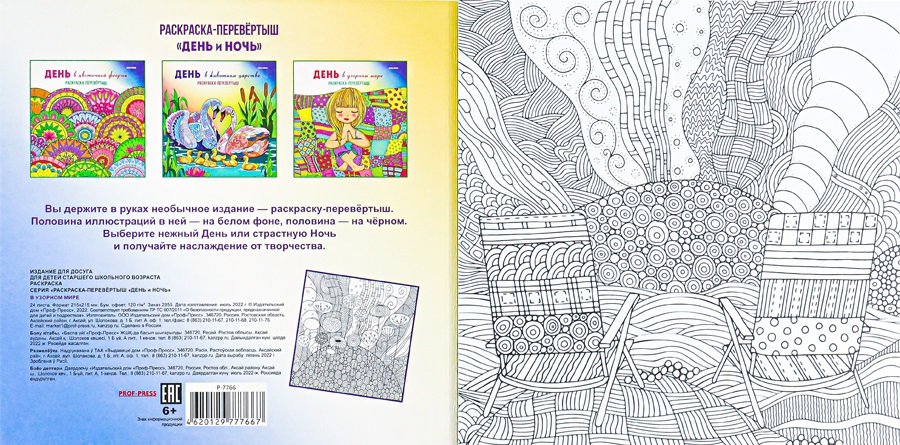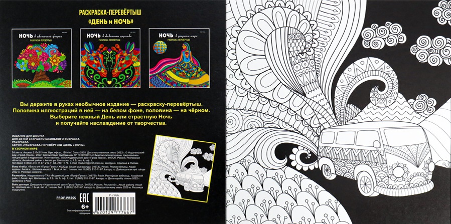 Антистресс-совет: вместе с капиллярными ручками рекомендуем раскраску-перевёртыш от PROF-PRESS, где половина иллюстраций выполнена на белом фоне, а другая — на чёрном. Начните с чёрных листов, благодаря чёрному фону вы сможете идеально раскрашивать, не выходя за границы рисунка.