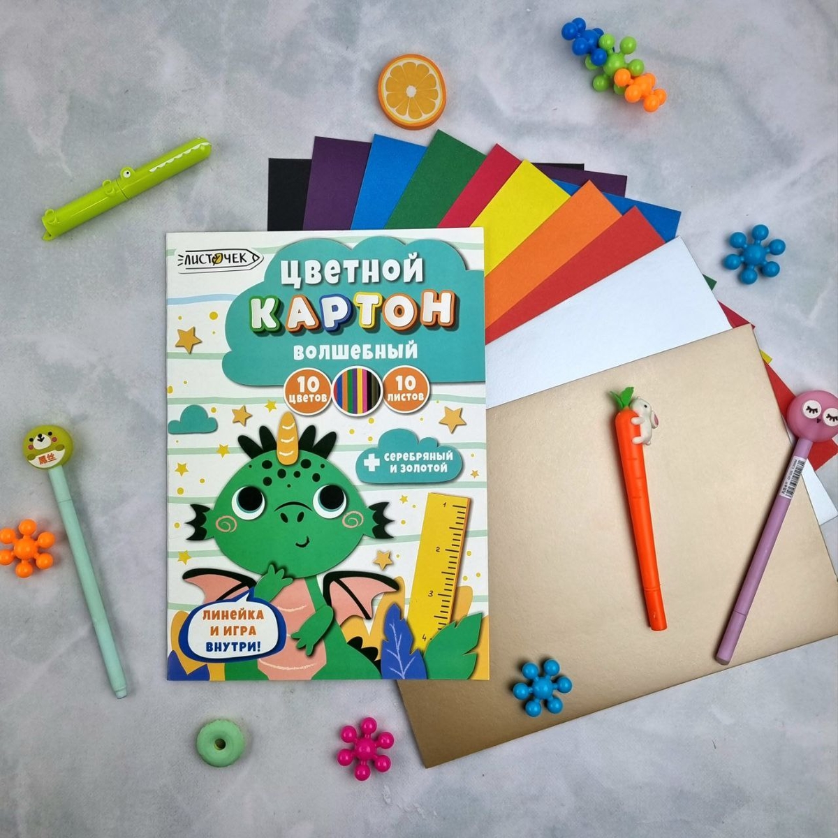 Набор цветного картона из 10 листов и 10 цветов Listoff отличается повышенным качеством: листы хорошо прокрашены, цвета яркие и насыщенные, листы отлично сгибаются и не оставляют заломов, а упаковка имеет привлекательный дизайн. Работа с картоном — это самый эффективный и недорогой способ развить у ребёнка воображение, сформировать правильное цветовосприятие и мелкую моторику, о важности которой не перестают твердить школьные педагоги и психологи. На обороте папки содержится занимательная игра «Собери игрушку» (фигура для вырезания и склеивания), которая делает набор развивающей продукцией для детей.