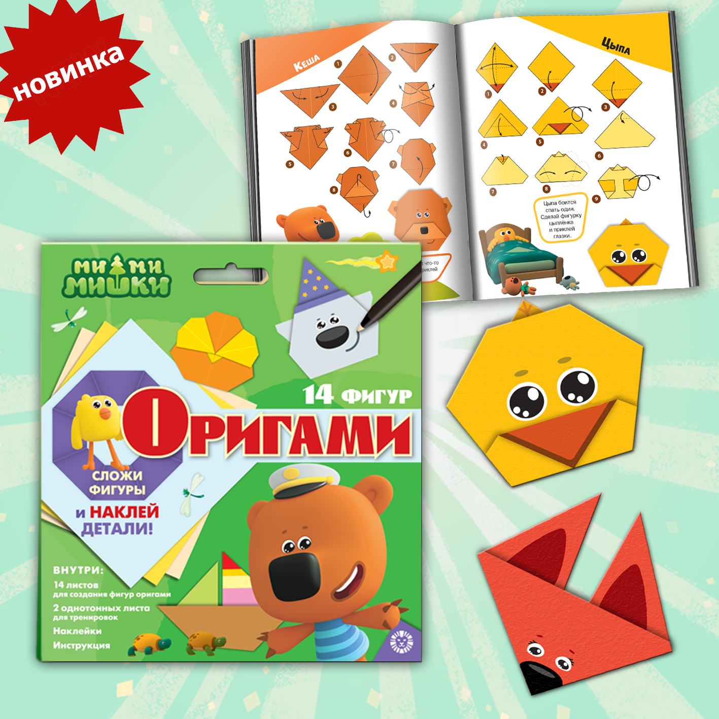Внутри яркого большого конверта — материал для складывания 7 бумажных фигурок. На каждом листе есть линии-подсказки, в комплект добавлены листы для тренировки. Герои получатся как живые, потому что их можно дополнить смешными наклейками-глазками, наклейками-носиками, наклейками-хвостиками и даже наклейками-семечками.