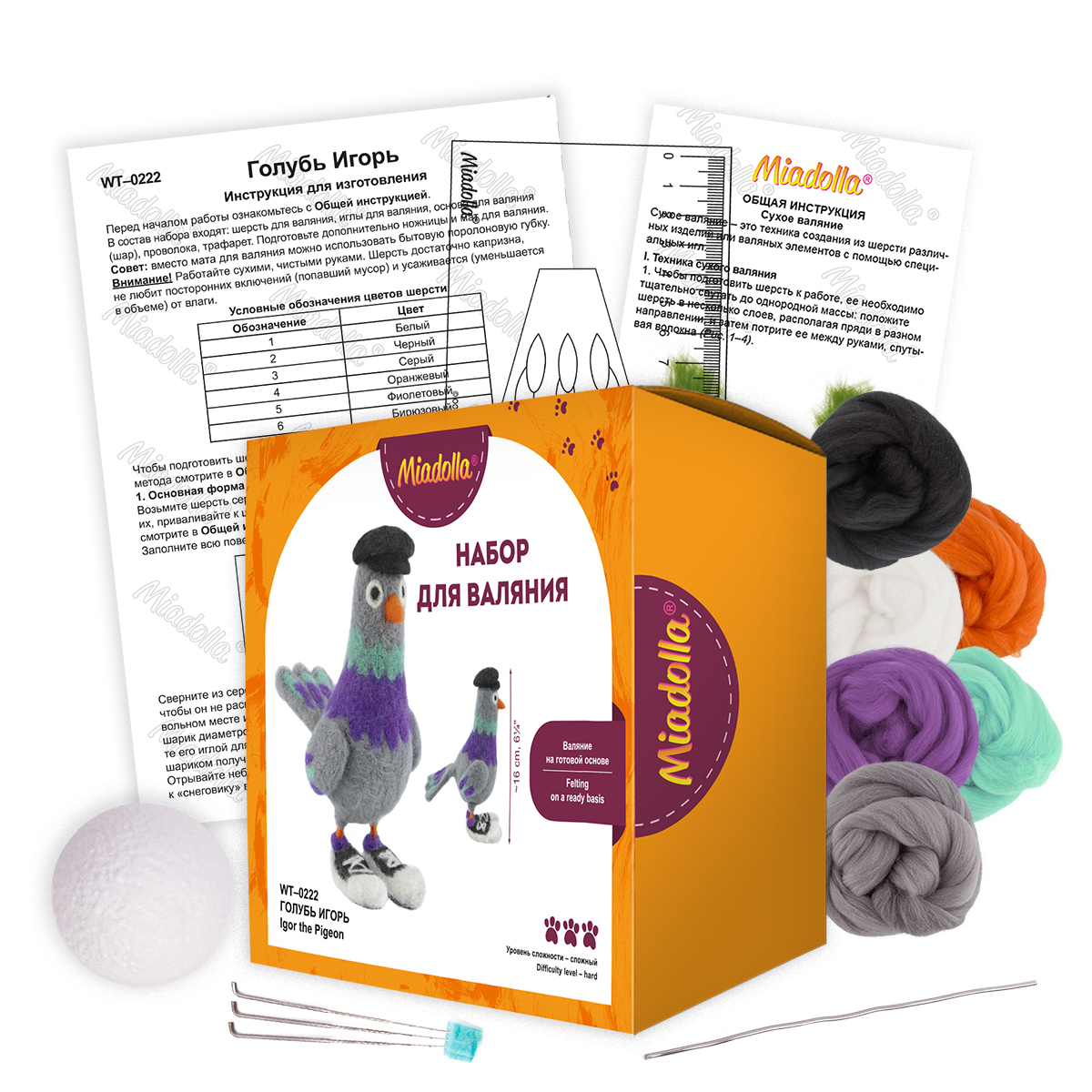 - «Голубь Игорь» (арт. WT-022) изготавливается в технике сухого валяния из натуральной шерсти. Это ироничный типаж в кепке и кедах — настоящий «свой парень на районе». Высота 17 см.