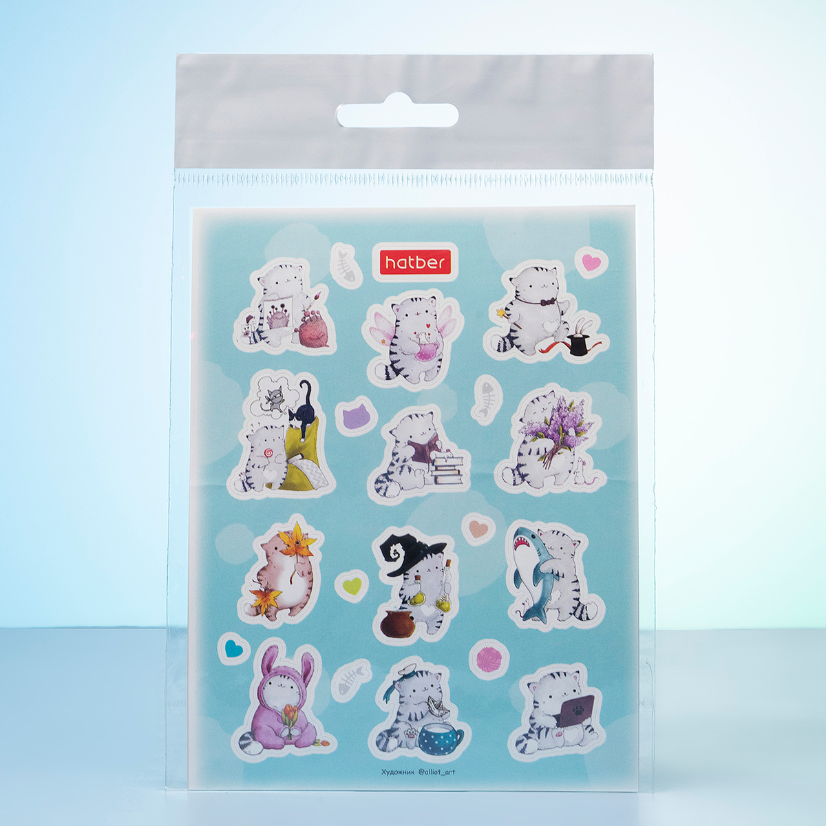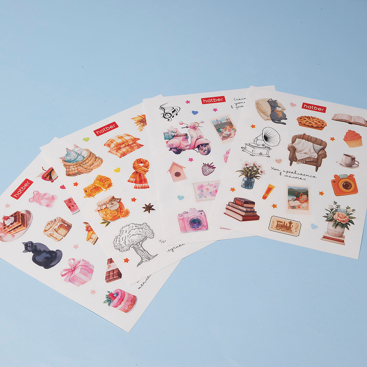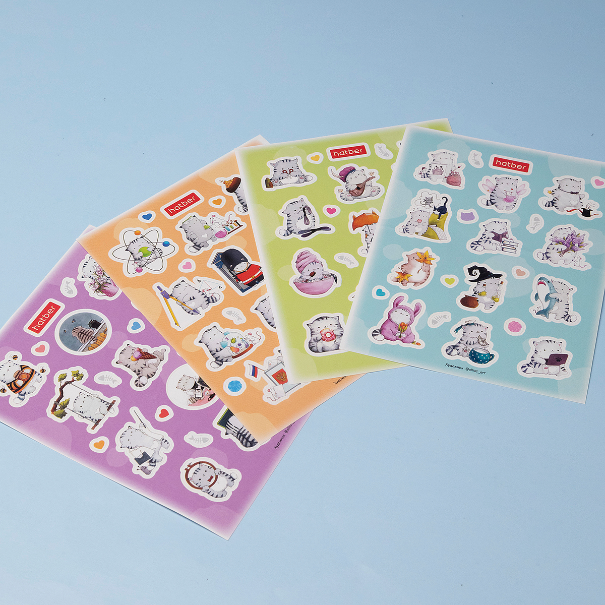 Наборы наклеек формата А6 (по 4 листа в наборе) от Hatber — отличное решение для такой творческой задачи. Милые, смешные, уютные и трогательные наклейки изготовлены на бумажной основе и помогут украсить что угодно: открытку, подарочную упаковку, записи, тетради, блокноты и т. д.